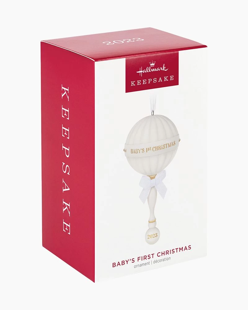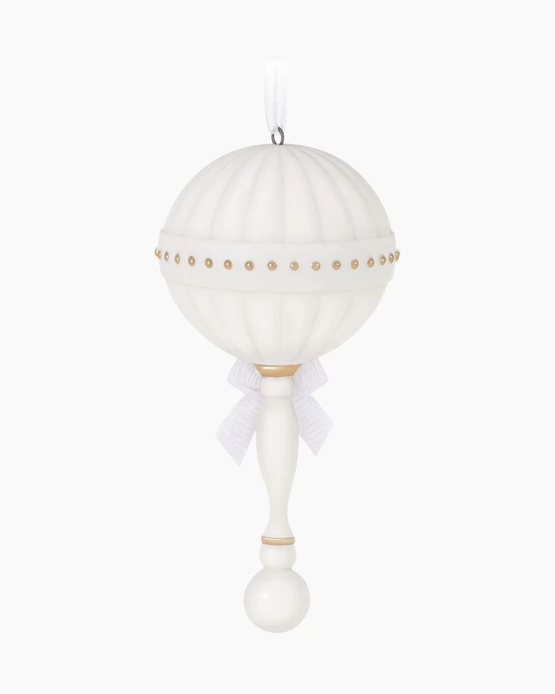 You’ll always remember your baby’s first Christmas. This sweet year-dated Christmas tree ornament features a bisque porcelain baby rattle embellished with metallic gold accents and a ribbon bow attachment to commemorate this special time for your family.