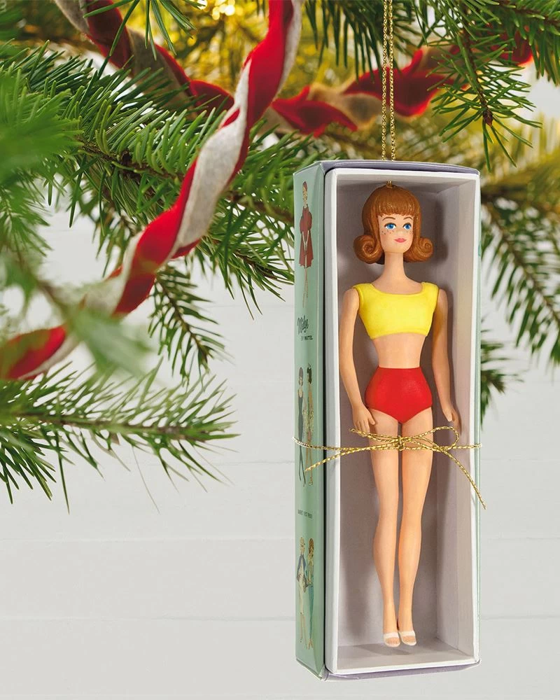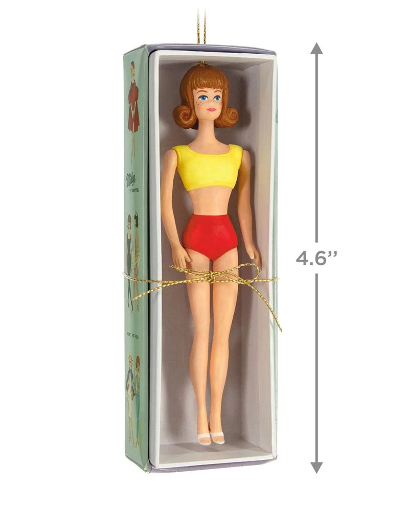 In 1963, fans of Mattel’s immensely popular fashion doll, Barbie, were introduced to her auburn-haired best friend, Midge. Dressed in her favorite two-piece bathing suit with chartreuse top and orange bottoms, Midge looks ready for a fun-filled day at the beach! This Christmas tree ornament features the iconic doll nestled in a replica of her original packaging.