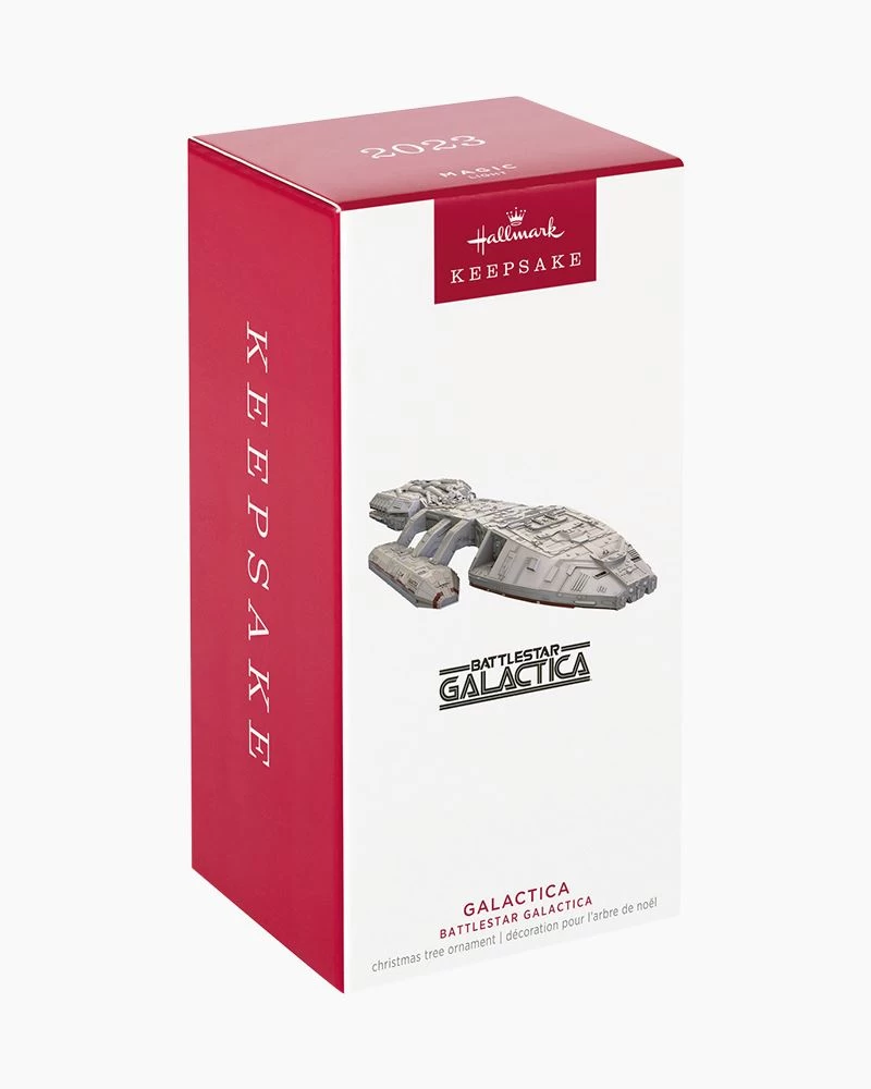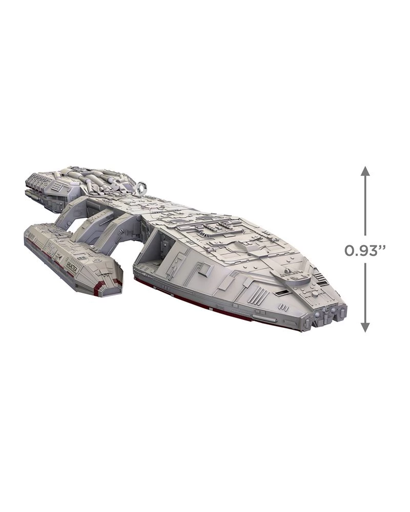 A sizeable battleship and spacecraft carrier, Battlestar Galactica was part of the Twelve Colonies’ defense fleet until a savage attack by the robotic Cylon race virtually destroyed those settlements. Under Commander Adama, Galactica led a ragtag fleet of ships and survivors in search of a new home on a legendary thirteenth colony called Earth. Celebrate their hopeful journey as seen on the beloved 1970s TV series with this Christmas tree ornament that features illuminated accents (battery-operated).