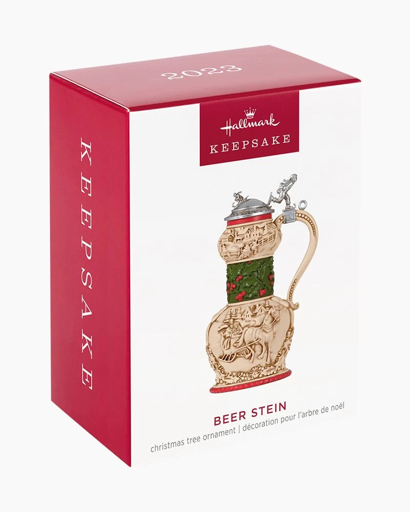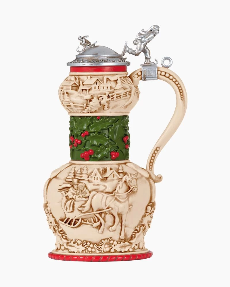 Raise a glass to timeless seasonal traditions with this Christmas tree ornament featuring vintage-inspired artwork and intricate craftsmanship. The stein body boasts classic scenes of horse-drawn carriages carrying people and Christmas trees across a snowy countryside, accented with evergreen and holly patterns. The mug’s functional opening lid, courtesy of an ice skater hinge, adds a fun touch.