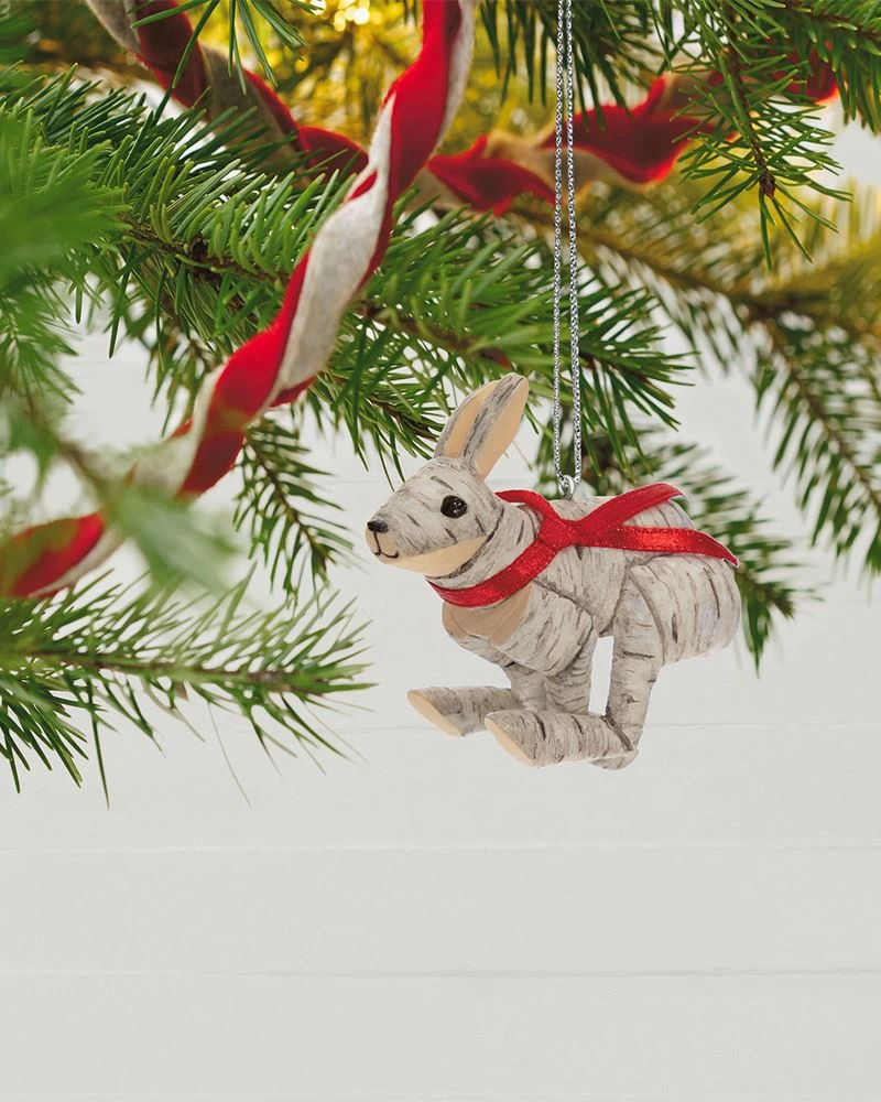 Dash into the season with this snowshoe hare Christmas tree ornament that looks like it’s constructed from birch wood logs. With a festive red ribbon scarf around its neck, this whimsical woodland friend is sure to put smiles on the faces of all who see it.
