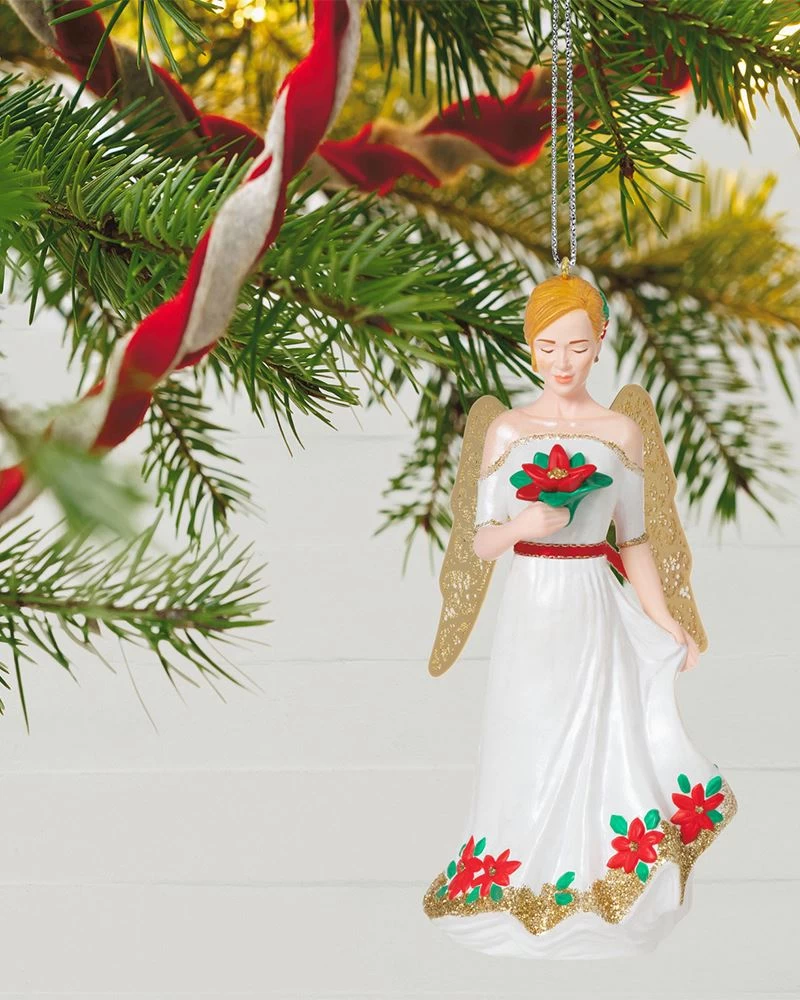 Fill the holiday season with love and good cheer when you display this Christmas tree ornament. Holding a vibrant red poinsettia to match the Christmas blooms decorating the hem of her dress, this divine darling invites you to celebrate and treasure the reasons for the season. Continue your Christmas Angels series with this ethereal decoration that features delicate metal wings and glitter accents.