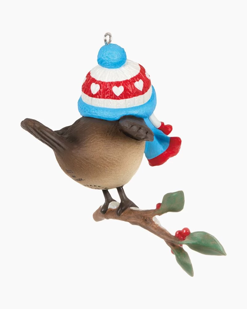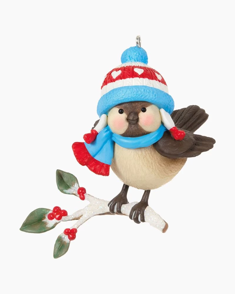 Celebrate 50 years of Hallmark Keepsake Ornaments and warm the hearts of all who see this charming complement to your Cozy Critters collection. This special edition Christmas tree ornament features a sweet little birdie bundled up in a blue and red scarf and hat, perched on a tree branch covered with glittery snow. Coordinating 7th in series sold separately.