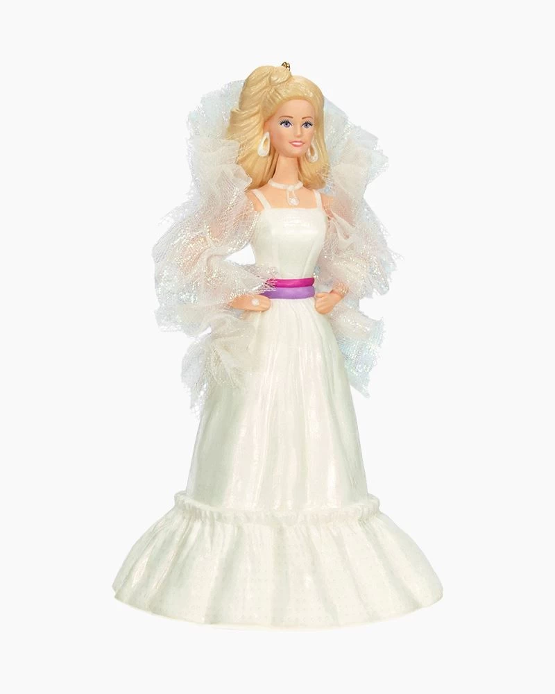 Inspired by the highly sought-after 1983 doll of the same name, this Crystal Barbie Christmas tree ornament shines with glamour from head to toe. The timeless fashion icon wears a shimmery ruffled ball gown, complete with a beautiful fabric stole attachment.