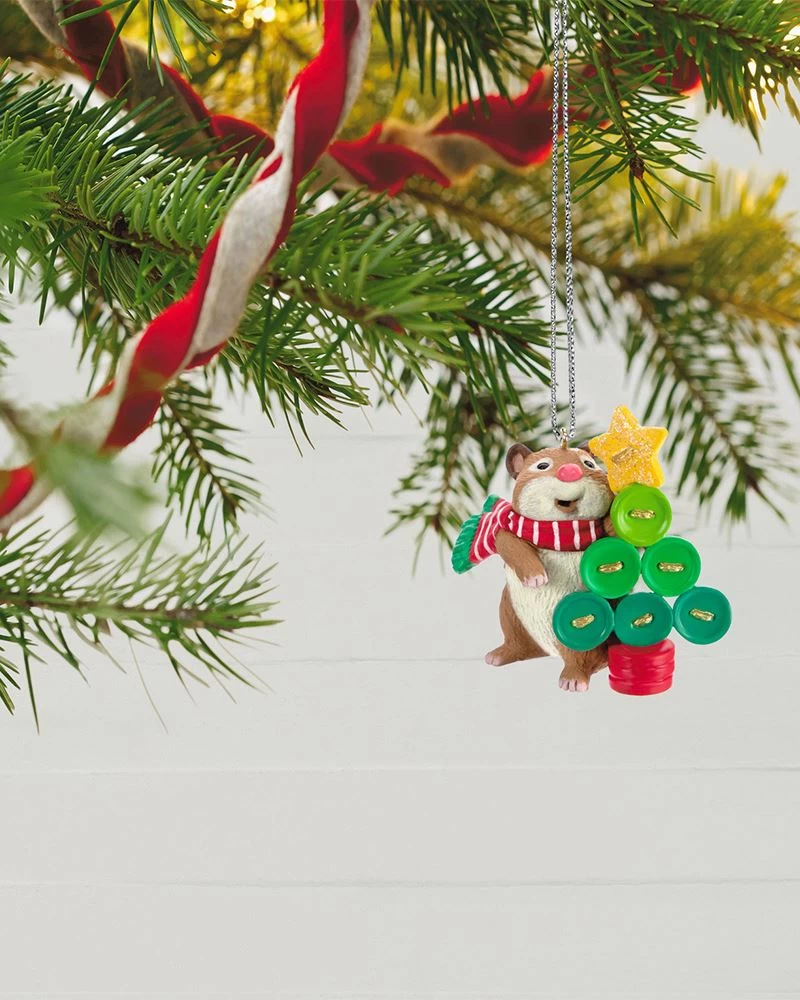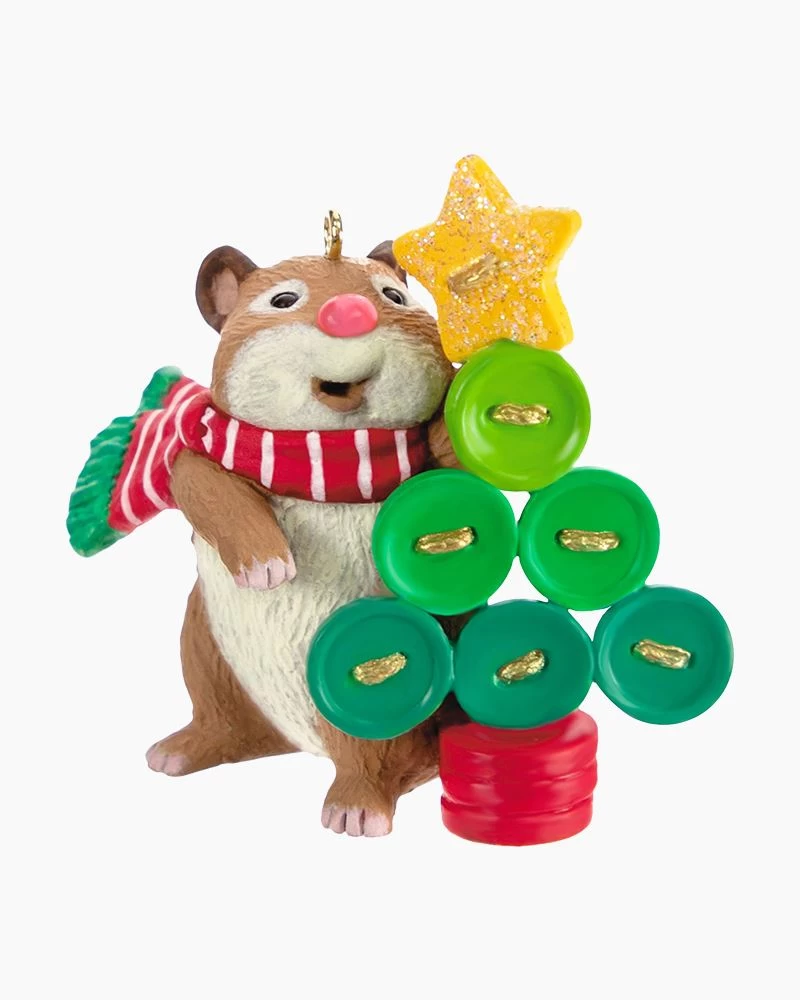 You won’t mind this cute little creature stirring on your tree! This happy hamster loves to create things that are just his size from colorful buttons. First in a charming new series, he wears a festive red and green scarf as he crafts a Christmas tree with a star-shaped button on top.