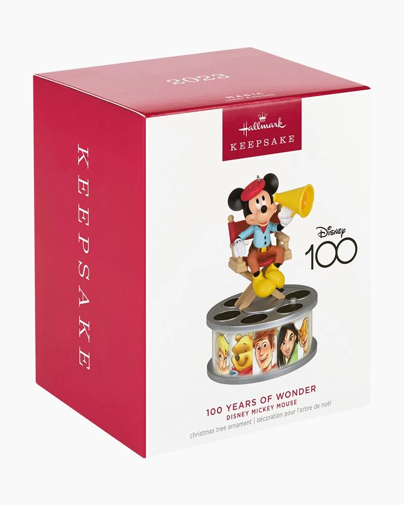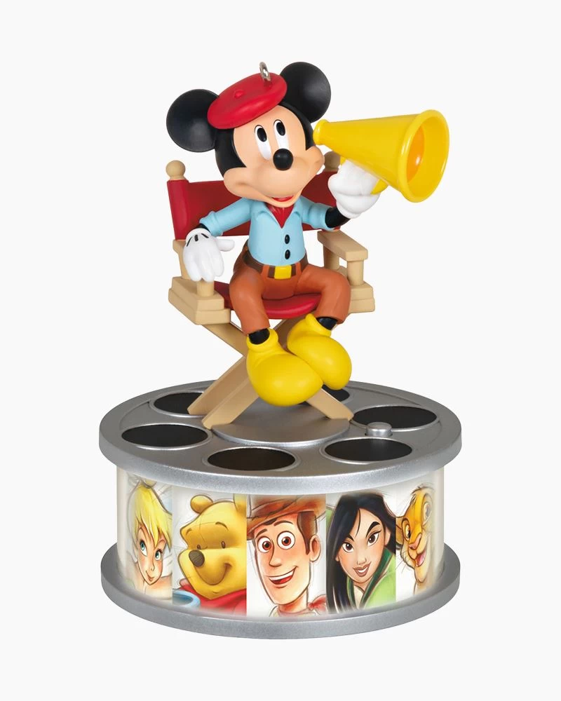 Celebrate 100 years of Disney wonder with this Mickey Mouse Christmas tree ornament. Director Mickey speaks while the film strip below lights up to highlight beloved Disney and Disney/Pixar animated characters (battery-operated): Winnie the Pooh, Woody, Mulan, Simba, Tiana, Nemo, Elsa, Miguel, Minnie Mouse, Snow White, Dumbo and Tinker Bell.