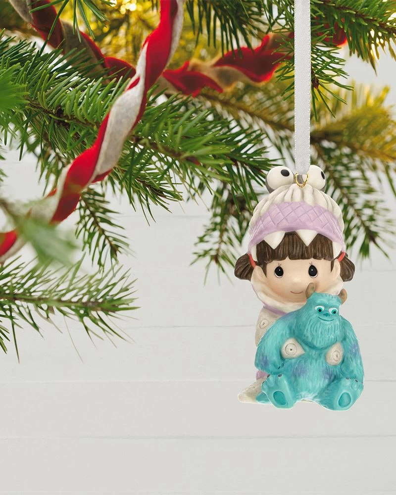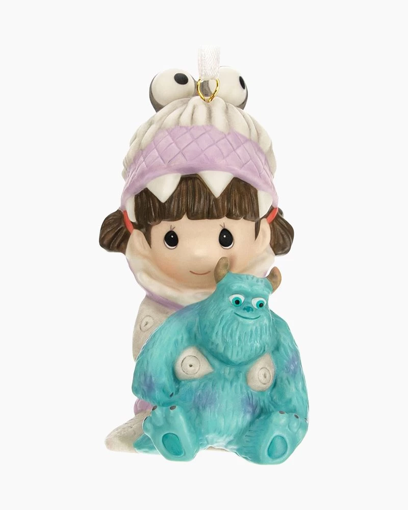 Despite everything he knew about the toxicity of the kids he made scream for their energy, Monsters, Inc., lead scarer James P. Sullivan couldn’t help but grow fond of the cute human child who snuck into Monstropolis. Relive the funny and endearing adventures of the Disney/Pixar movie with this porcelain Christmas tree ornament featuring Boo in her monster disguise holding a Sulley doll. Signature Precious Moments styling captures the sweet charm of these beloved characters.