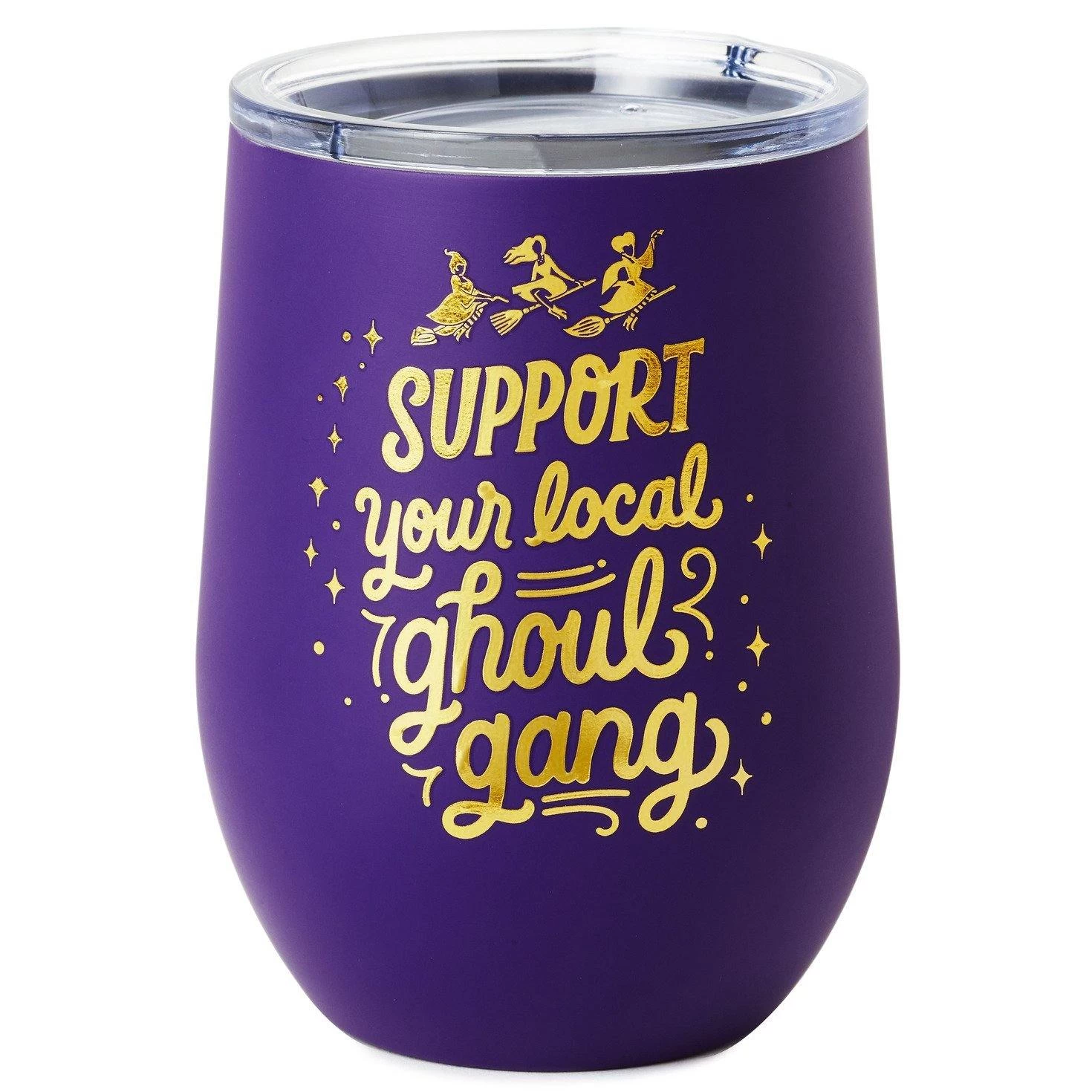 Conjure up a good time with your favorite beverage served in this “Hocus Pocus” stainless steel stemless glass. Fans of the iconic Halloween film will love the gold foil design of the Sanderson Sisters on their broomsticks. Insulated construction makes this tumbler perfect for holding hot or cold drinks and a clear lid with sliding lock keeps spills to a minimum, so things won’t run amuck.