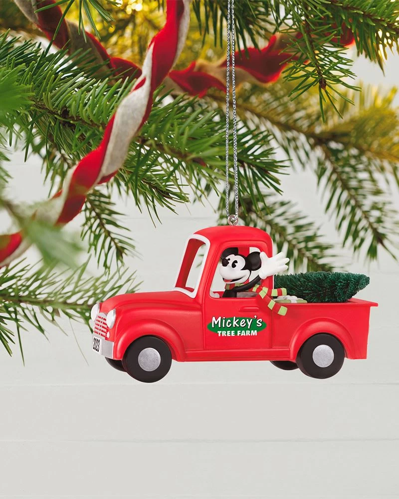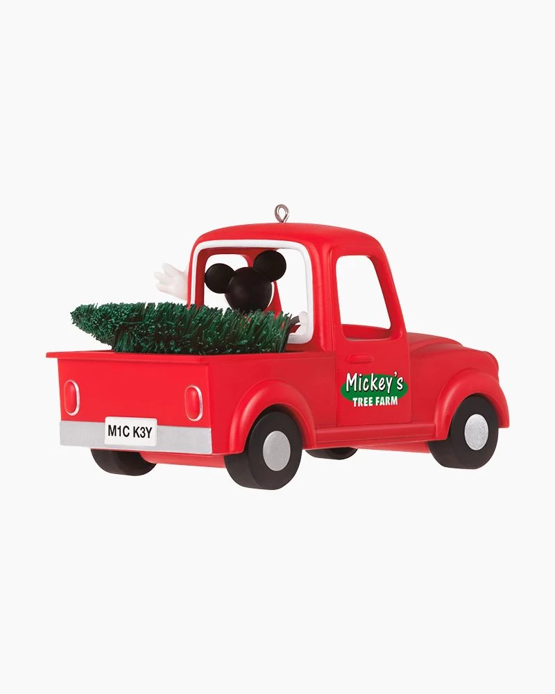 It’s time to bring home the tree! Pick up some holiday spirit with this fun Christmas tree ornament that features Mickey Mouse behind the wheel of a retro red truck from his tree farm. The festive design includes a bottlebrush tree attachment in the truck bed and wheels that turn.