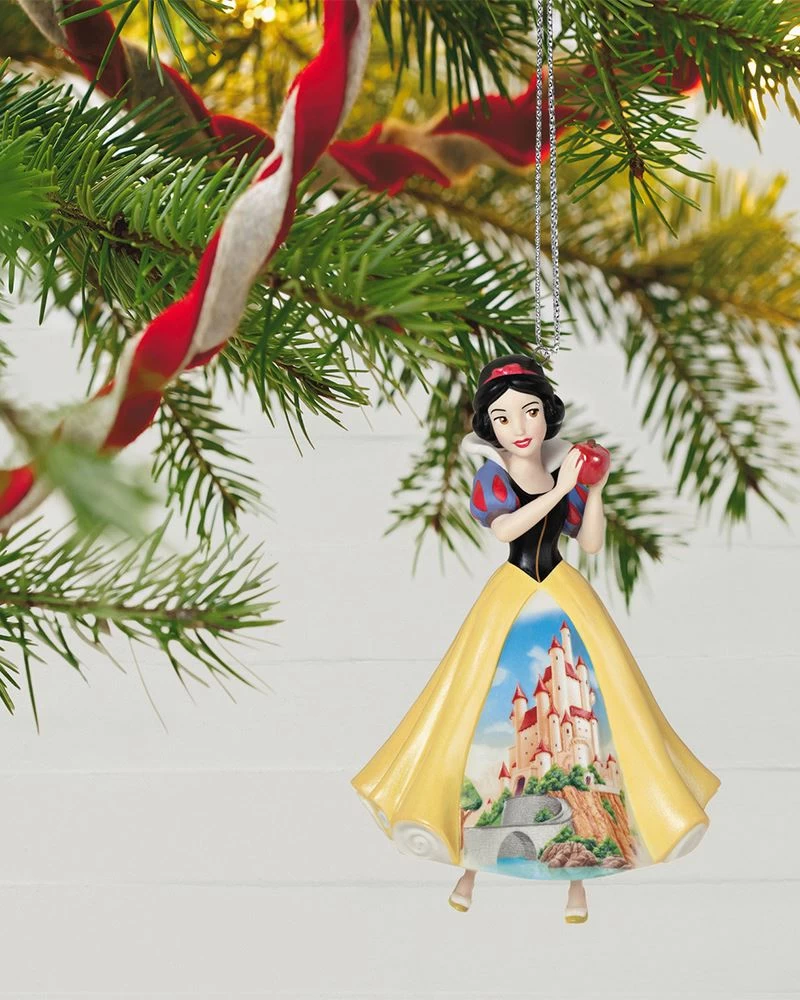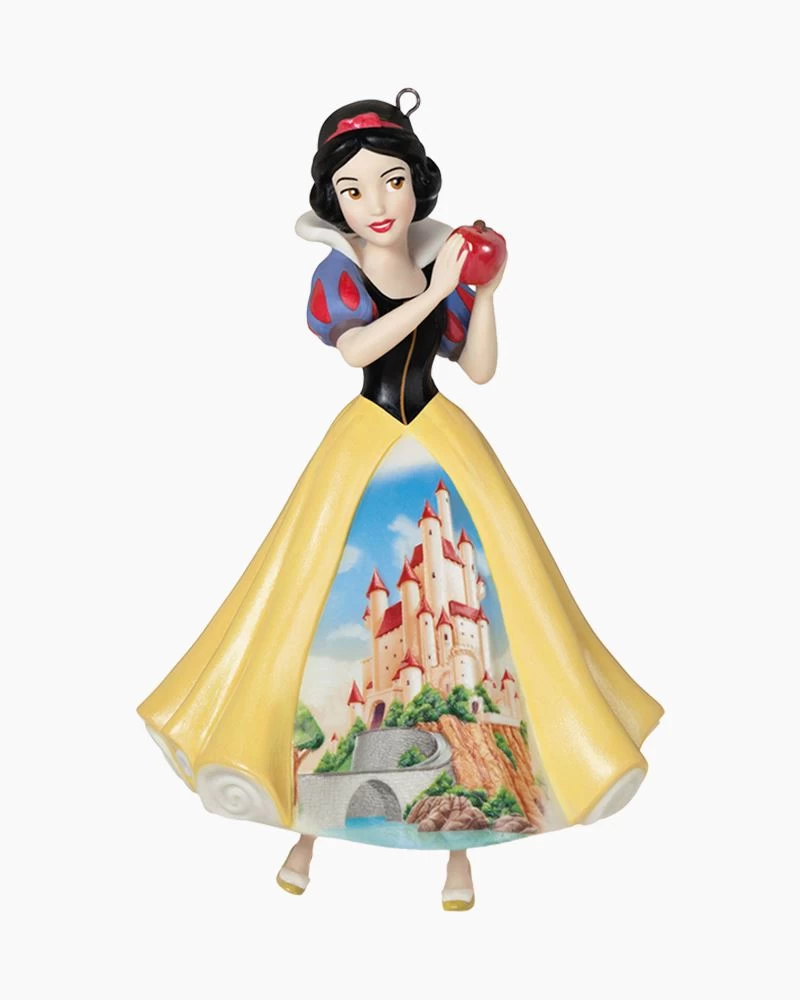 Celebrate Snow White’s happily ever after with this stunning Christmas tree ornament. Fourth in the Disney Princess Celebration series, this premium porcelain design features the beloved Disney Princess holding a glossy red apple. A radiant iridescent finish graces the top layer of Snow White’s skirt, which frames an idyllic scene of Prince Charming’s castle from the classic animated film.