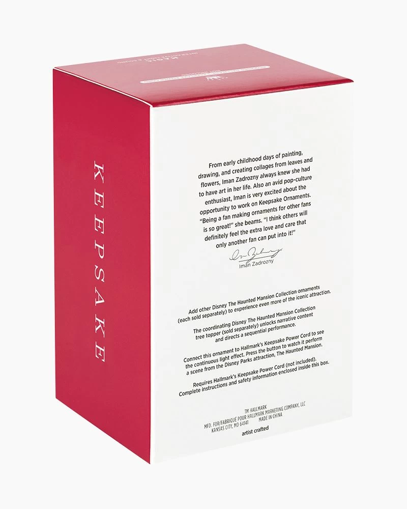 - Key Features: Connect the Storytellers Interactive Light and Sound ornament to Hallmark’s Keepsake Power Cord (sold separately) to see the continuous light effect. Press the button to watch it perform a scene from the Disney Parks attraction, The Haunted Mansion. Add other Disney The Haunted Mansion Collection ornaments to experience even more of the iconic attraction. The coordinating Disney The Haunted Mansion Collection tree topper unlocks narrative content and directs a sequential performance