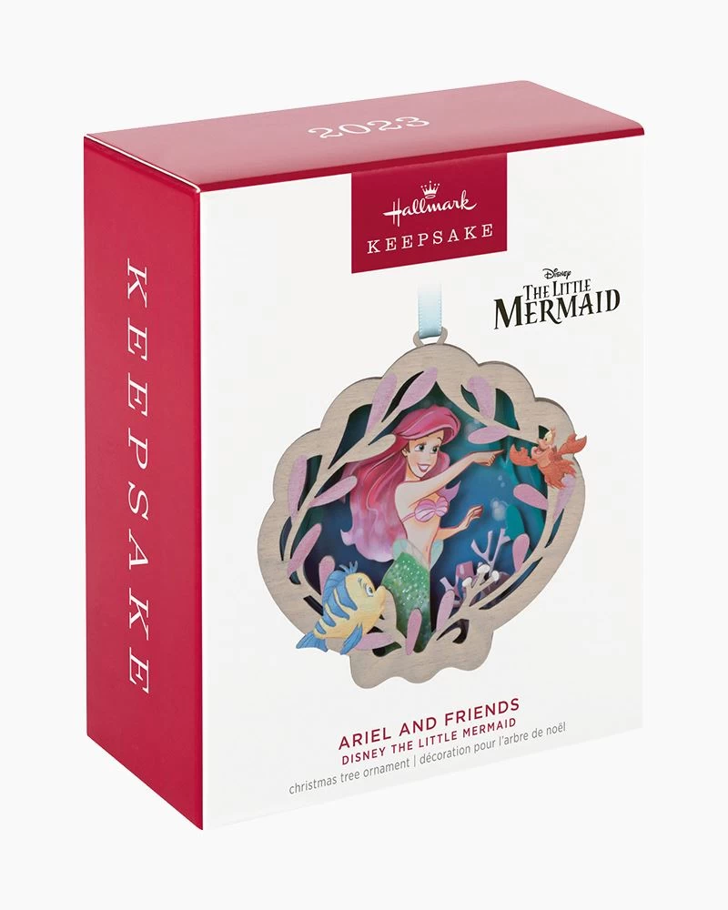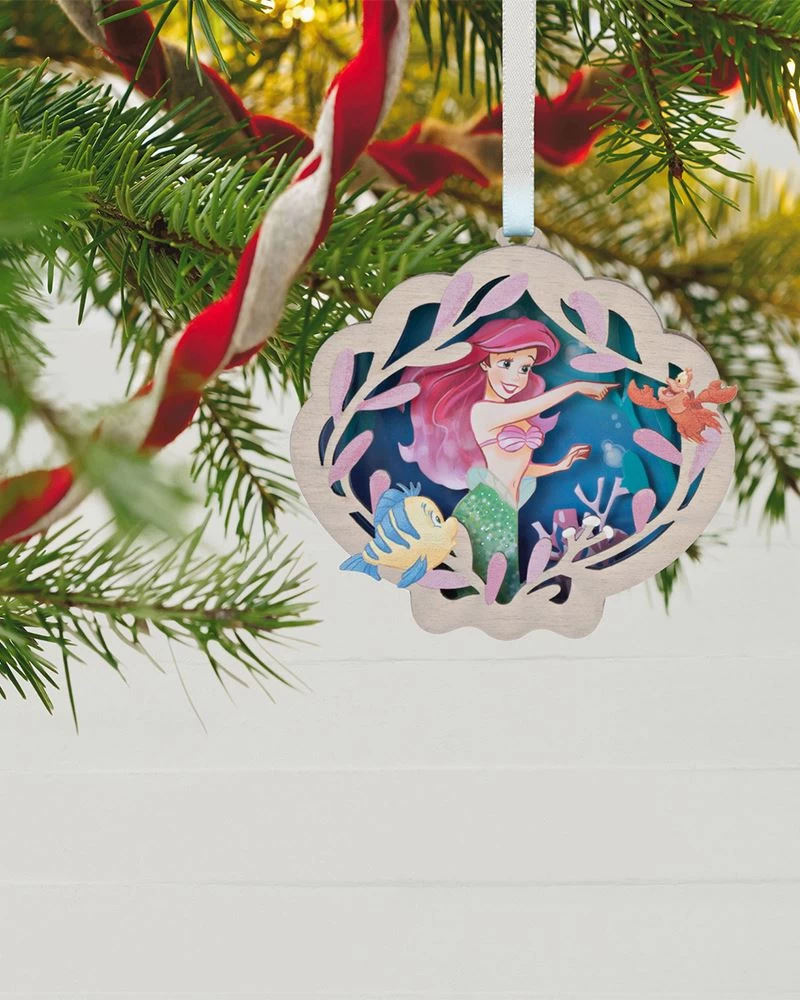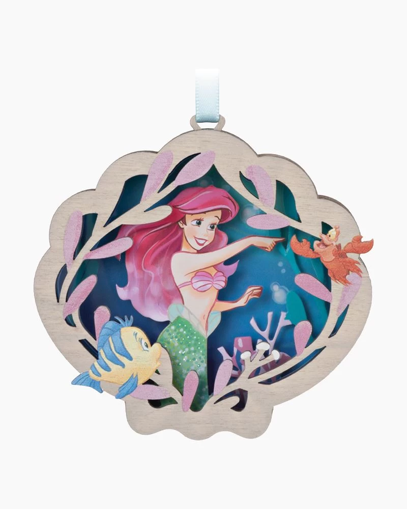 Treasure the joys of friendship and adventure with this colorful Christmas tree ornament. Pretty laser-cut wood frames an intricate papercraft scene featuring Ariel with her friends Flounder and Sebastian. Celebrate the classic animated movie “The Little Mermaid” with this charming decoration that makes a wonderful gift for Disney fans of all ages.