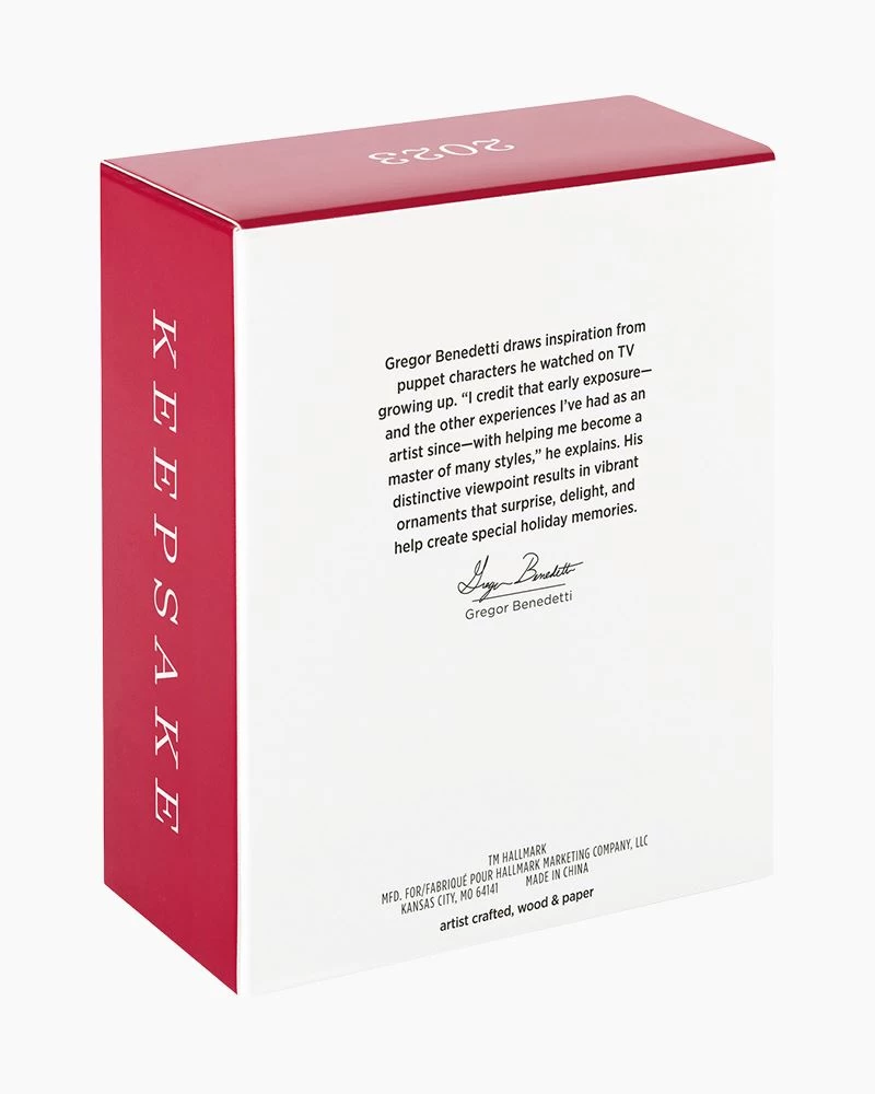 - Additional Details: Artist crafted by Gregor Benedetti. Wood, paper and plastic Christmas tree ornament