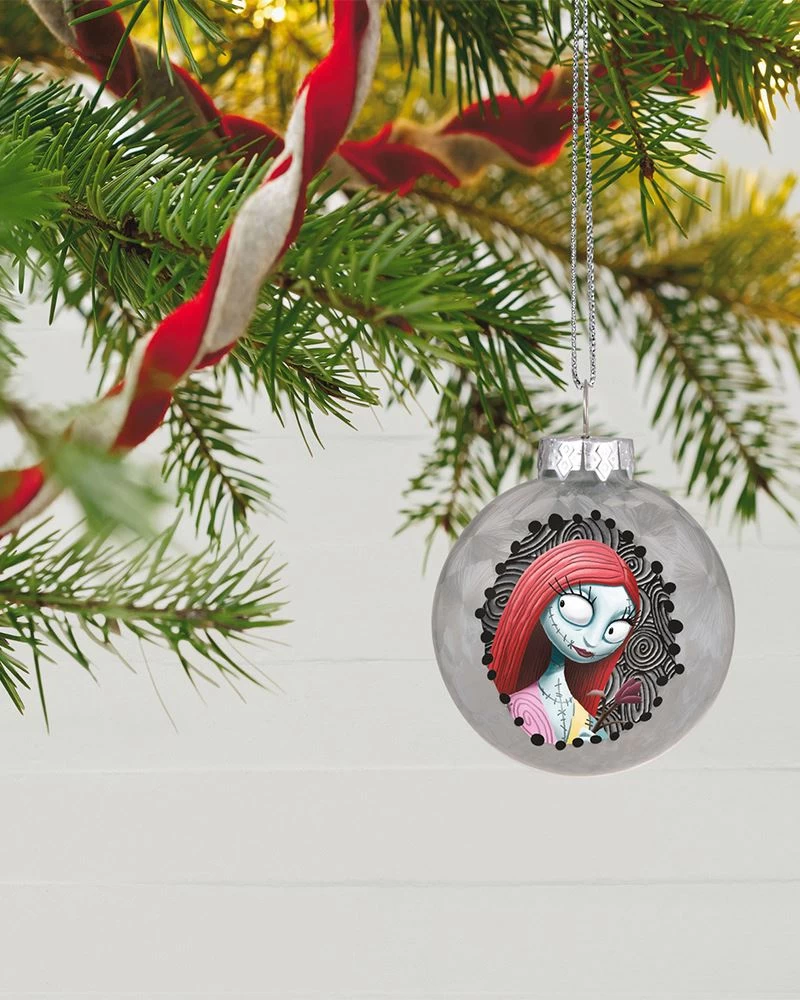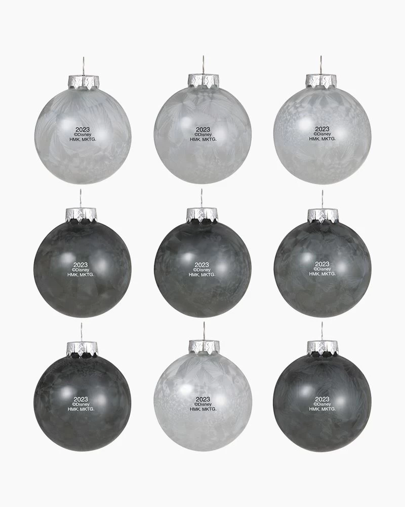 Spread the spirit of Halloween Town to your tree with this set of nine Christmas tree ornaments. A combination of silver and black blown glass ornaments each feature a favorite character from “The Nightmare Before Christmas”: Jack Skellington dressed as Sandy Claws, Sally, Zero, Oogie Boogie, Scary Teddy, Undead Duck, Lock, Shock and Barrel.