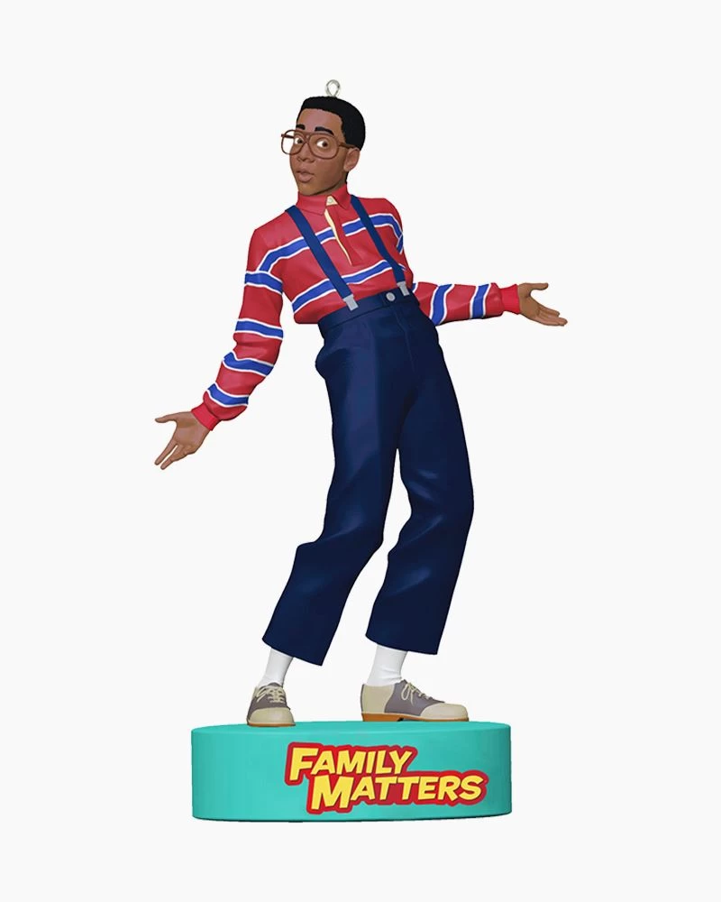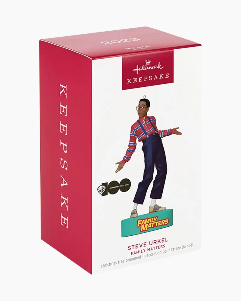 Let everyone’s favorite ’90s-sitcom neighbor and nuisance charm his way into your holiday celebrations. Steve Urkel wears his iconic suspenders and high-water pants in this fun “Family Matters” Christmas tree ornament. Press the button when no one is looking to play iconic phrases from the TV show and leave them wondering “Did I do that?” (battery-operated).