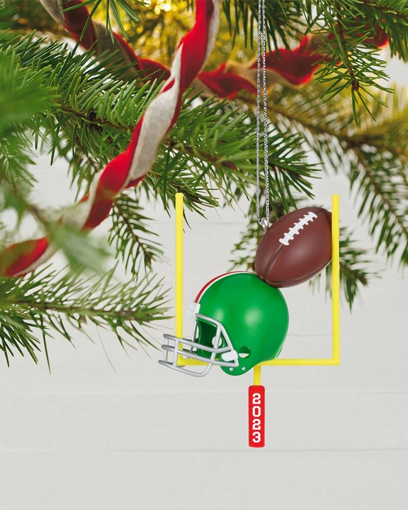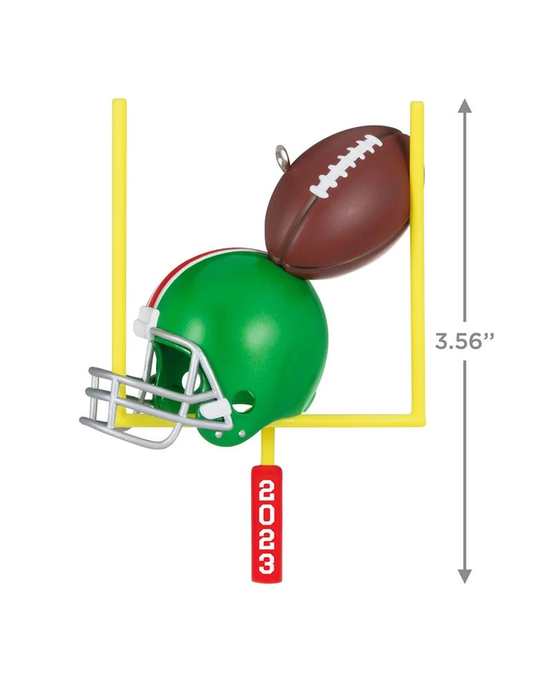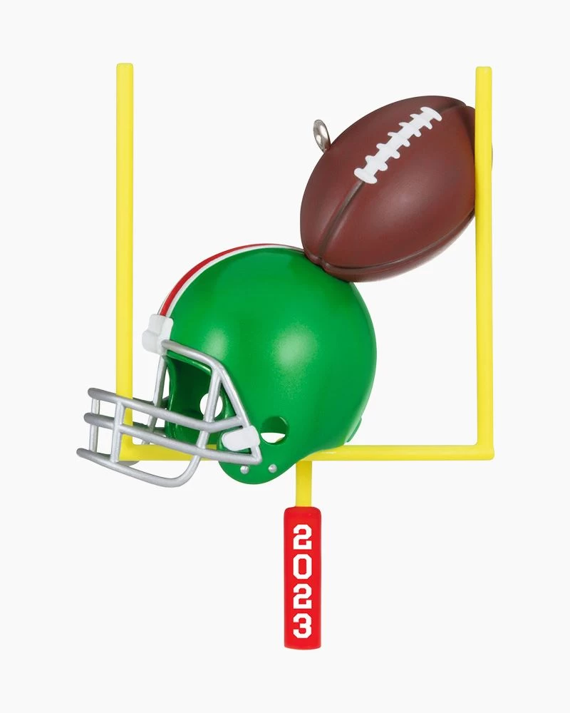 Commemorate the 2023 football season with this fun Christmas tree ornament that features a football and helmet resting atop goal post uprights. The year-dated decoration is perfect for celebrating your favorite little MVP or an appreciated coach.