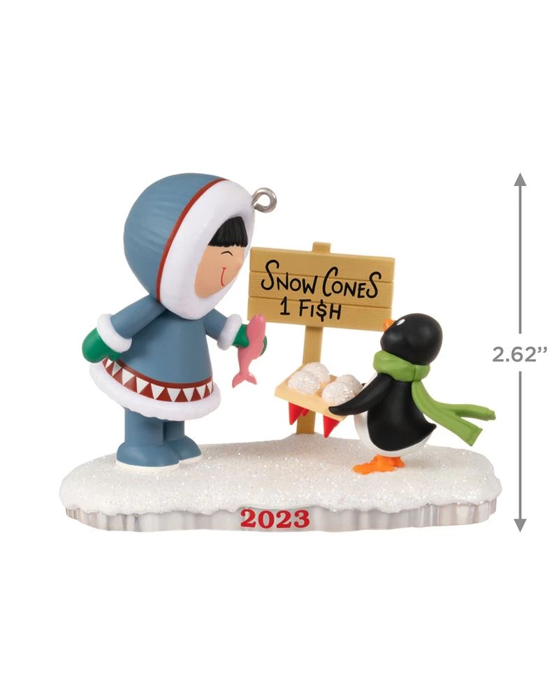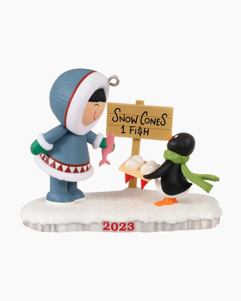 Delight in wintry thoughts of a tasty treat from the tundra with this adorable addition to the Frosty Friends series. This year’s Christmas tree ornament features Frosty buying a snow cone from a penguin friend for the reasonable price of one fish.