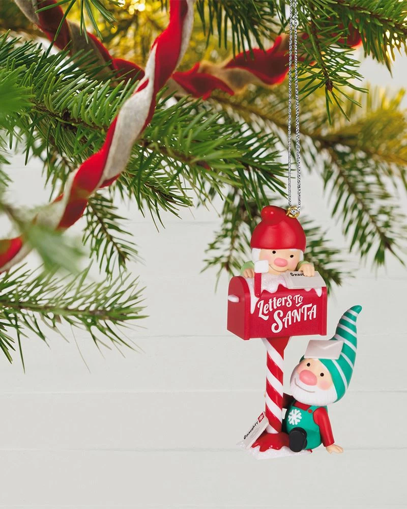 Send some holiday spirit to all who see this cute Christmas tree ornament. Gnaughty and Gnice, a pair of charming gnomes, are gathered around a candy-cane-striped mailbox preparing to mail their letters to Santa.