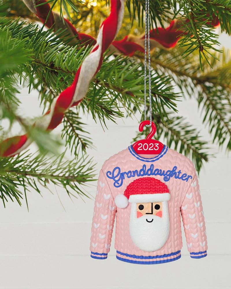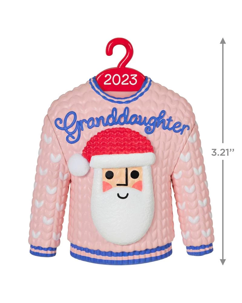 Your granddaughter will be tickled pink to receive this Christmas tree ornament. The festive design features a pink and purple sweater on a year-dated hanger with a cheerful Santa face and “Granddaughter” decorating the sweater front.