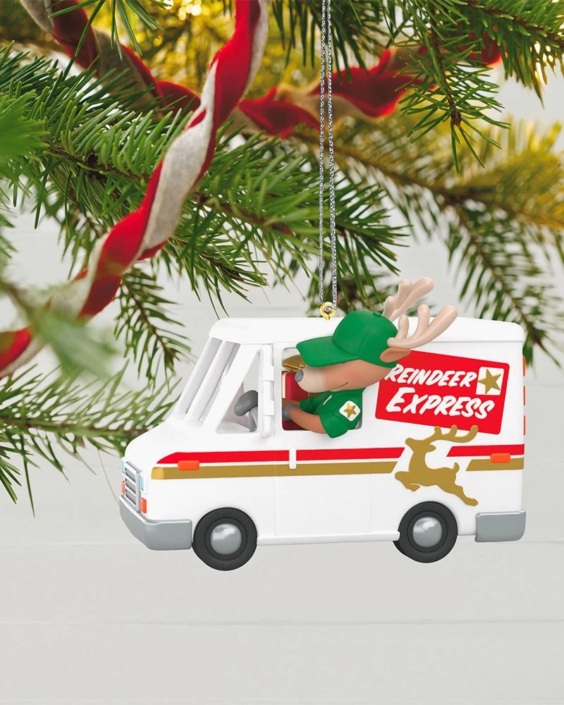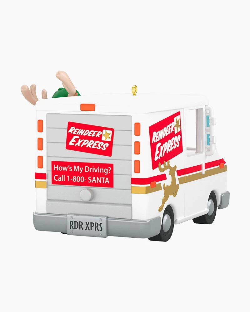 Speed into holiday fun with this hilarious Christmas tree ornament that features a mischievous reindeer behind the wheel of a delivery truck. The musical decoration plays part of the classic song “Grandma Got Run Over by a Reindeer” (battery-operated).