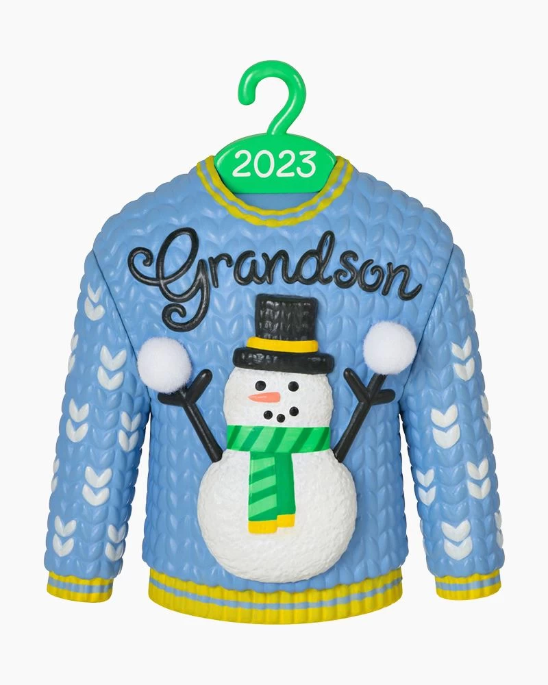Your grandson will get a kick out of this Christmas tree ornament. The festive design features a blue and yellow sweater on a year-dated hanger with a cheerful snowman holding snowballs and “Grandson” decorating the sweater front.
