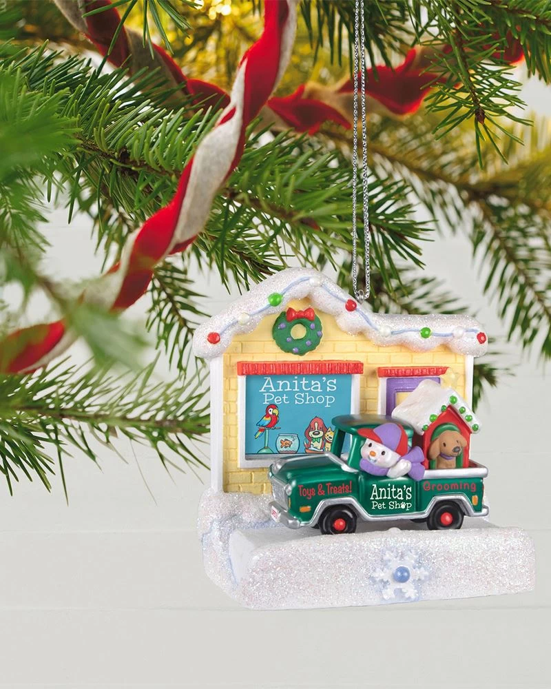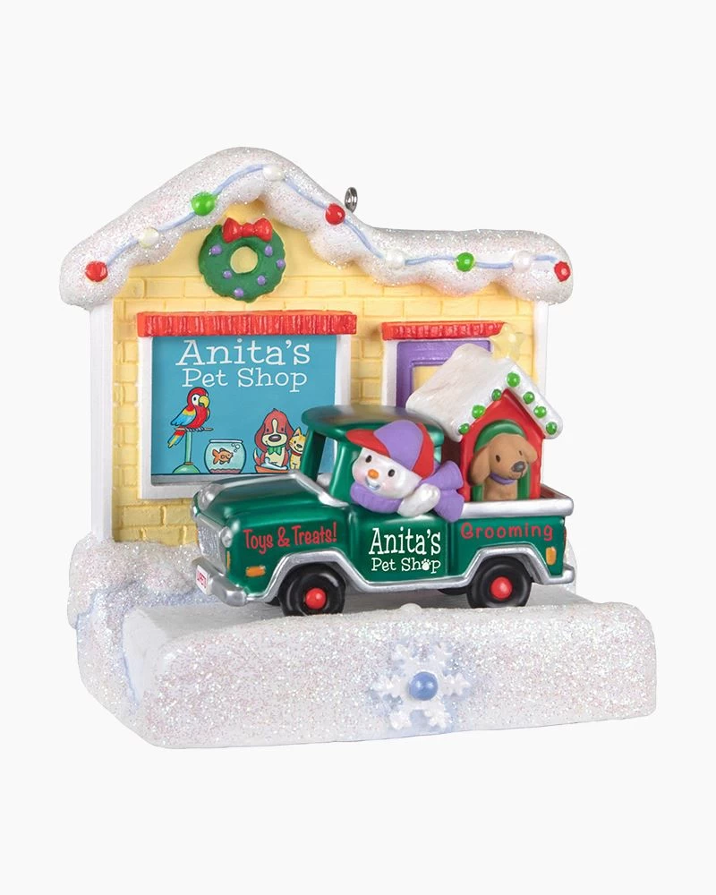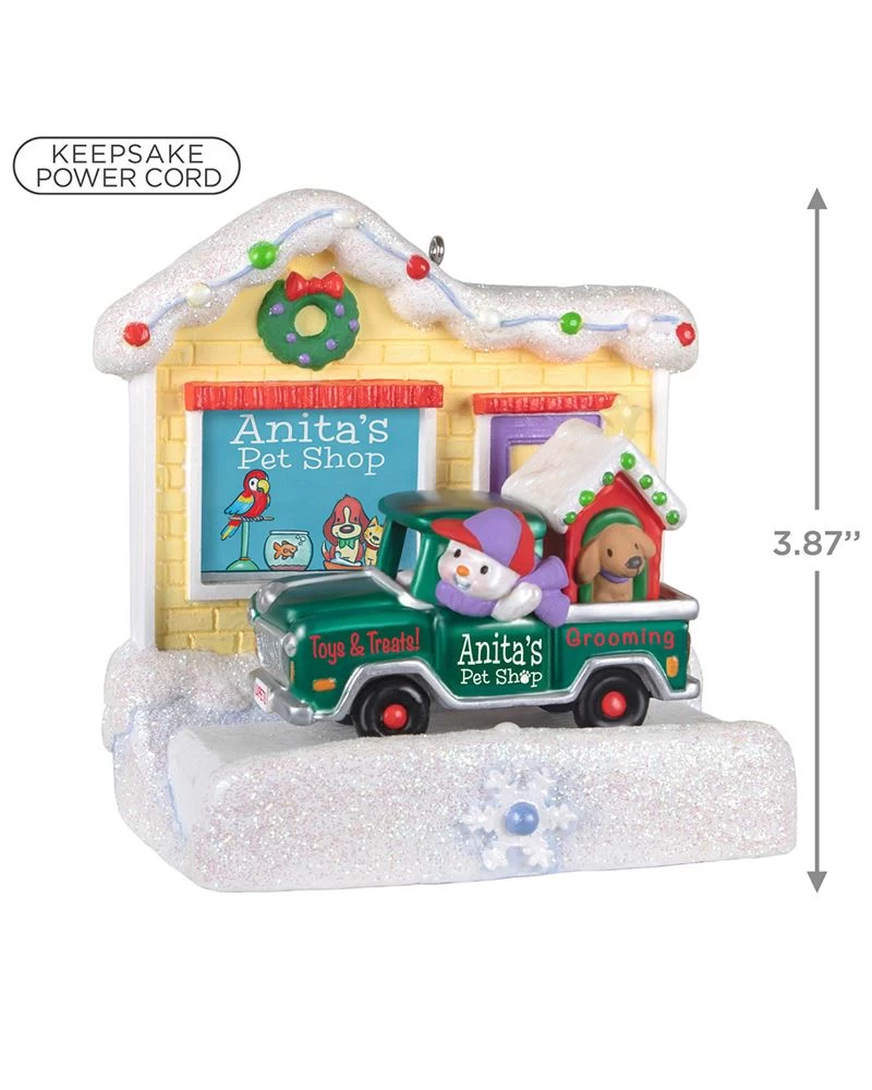 Someone’s getting a new puppy for Christmas! Pet lovers will delight in this Christmas tree ornament featuring a glittery snow scene of a cute pet store and a snowman transporting a pup and doghouse in the shop’s truck. Connect to Hallmark’s Keepsake Power Cord (sold separately) for continuous light, then press the button to hear it play “Deck the Halls.” Connect other Happy Holiday Parade Collection Storyteller ornaments – Joanne’s Christmas Boutique and Gregor’s Trattoria (each sold separately) – to unlock additional amazing interactive performances.