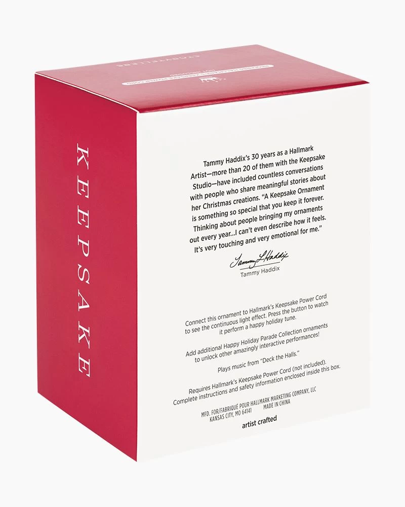- Key Features: Connect this Magic Light and Sound ornament to Hallmark’s Keepsake Power Cord (sold separately) to see the continuous light effect. Press the button to hear it play music from “Deck the Halls.” Add other Happy Holiday Parade Collection ornaments to unlock additional amazingly interactive performances