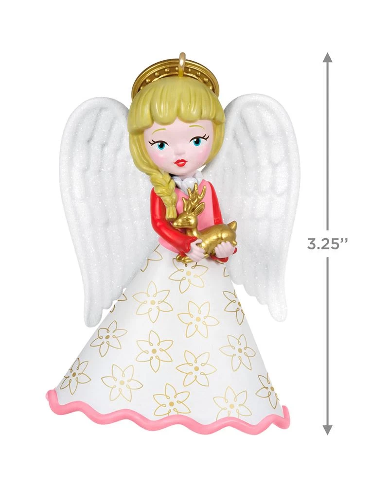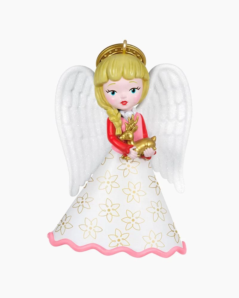 Share in the beauty and joy of the holidays when you display this vintage-inspired angel Christmas tree ornament. With a charming retro look, the sweet cherub holds a tiny reindeer and wears a pretty poinsettia-themed gown, gold halo and glittery wings.