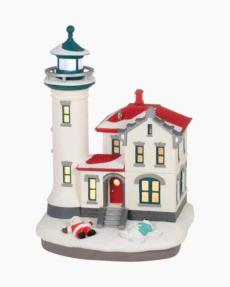 Spread holiday cheer with this Christmas tree ornament that features Santa and his polar bear pal making snow angels outside of their lighthouse home. The beacon flashes in the tower and a soft glow emanates from the home’s windows when connected to Hallmark’s Keepsake Power Cord (sold separately).