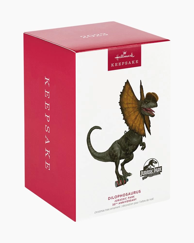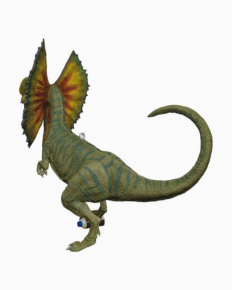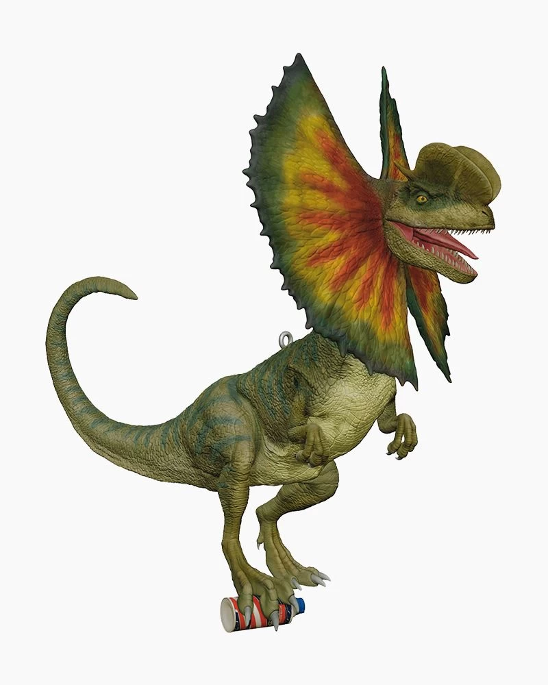 In the summer of 1993, an ambitious entrepreneur named John Hammond spoke four words that changed the world: “Welcome to Jurassic Park.” Celebrate the 30th anniversary of the edge-of-your-seat science-fiction thriller “Jurassic Park” with this Christmas tree ornament featuring the Dilophosaurus that devoured computer guru Dennis Nedry. The juvenile prehistoric carnivore stands triumphantly on the shaving cream can that held the stolen dinosaur embryos.
