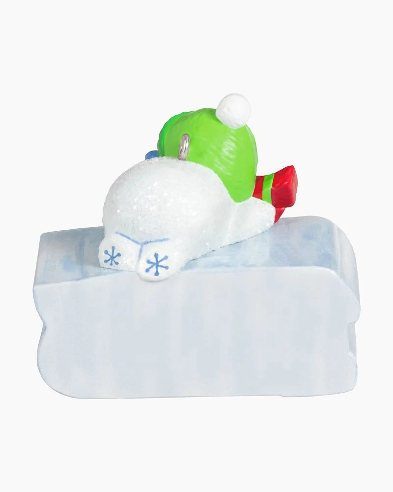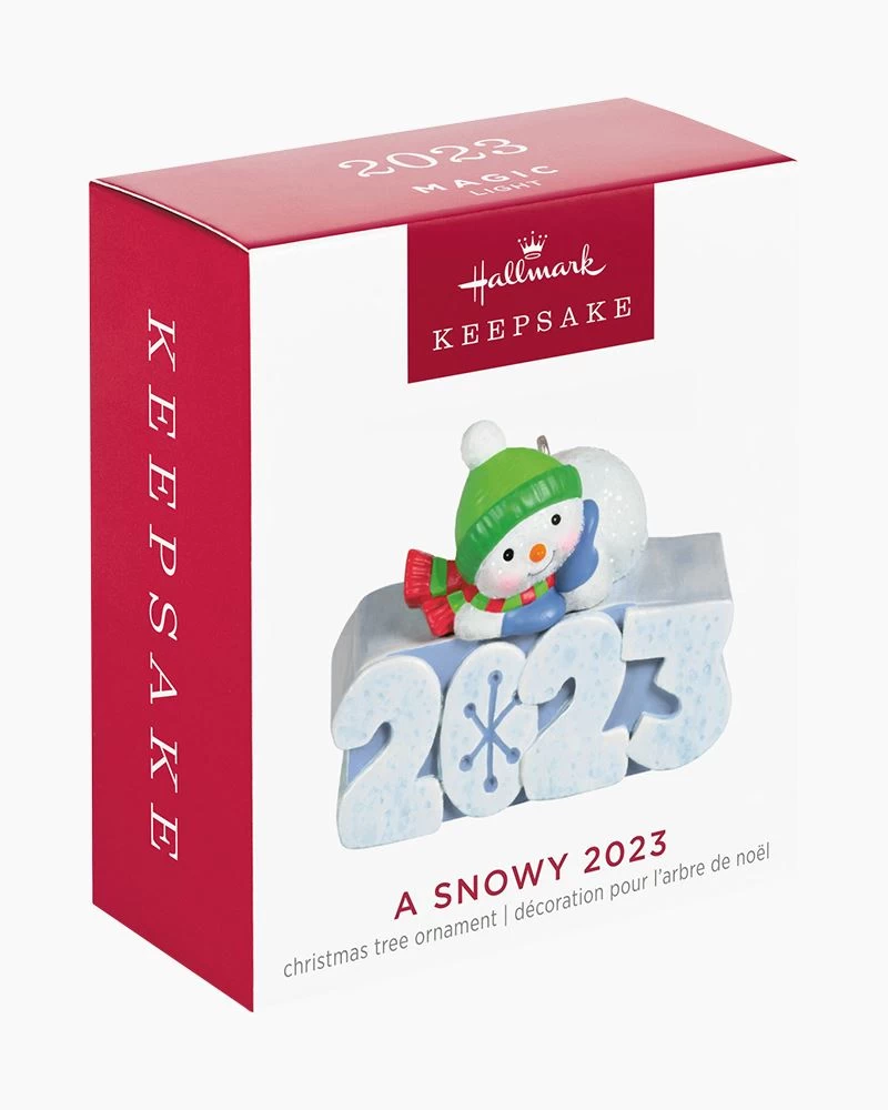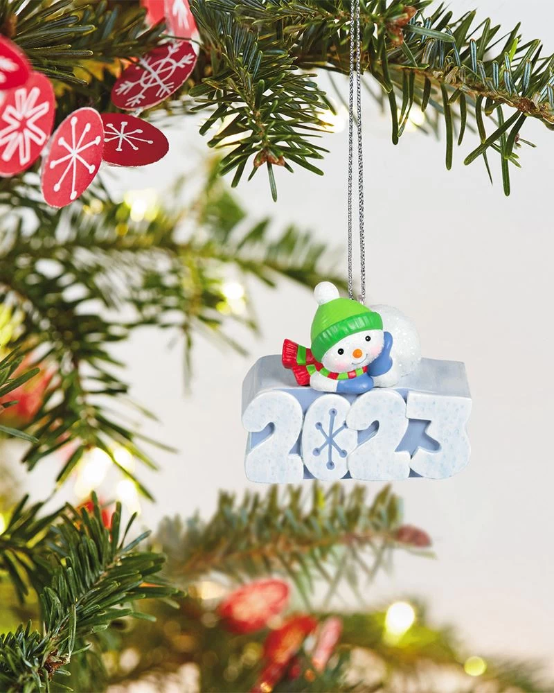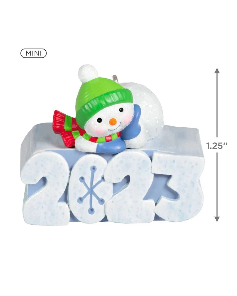 Celebrate a memorable year with this miniature Christmas tree ornament. The shimmering design features a glittery, bundled-up snowman relaxing atop snow-sculpted “2023” numbers that light up when you push the button (battery-operated).
