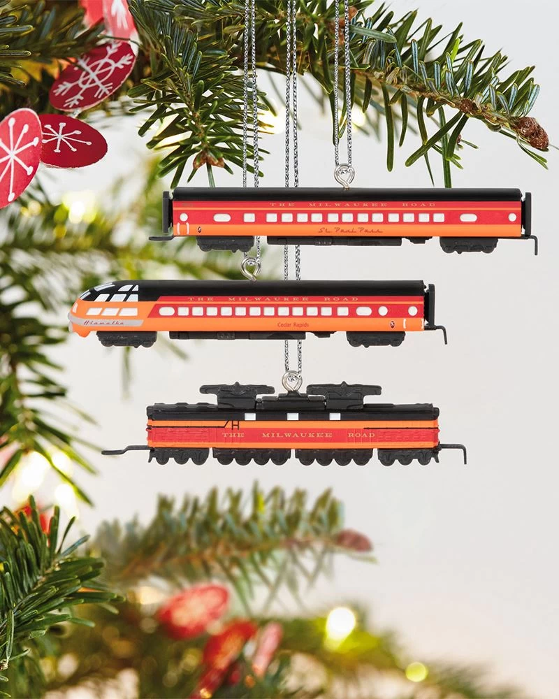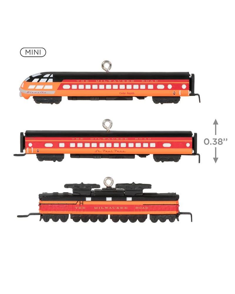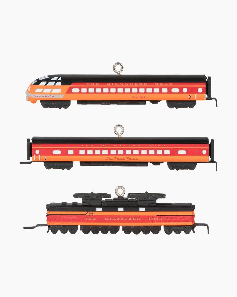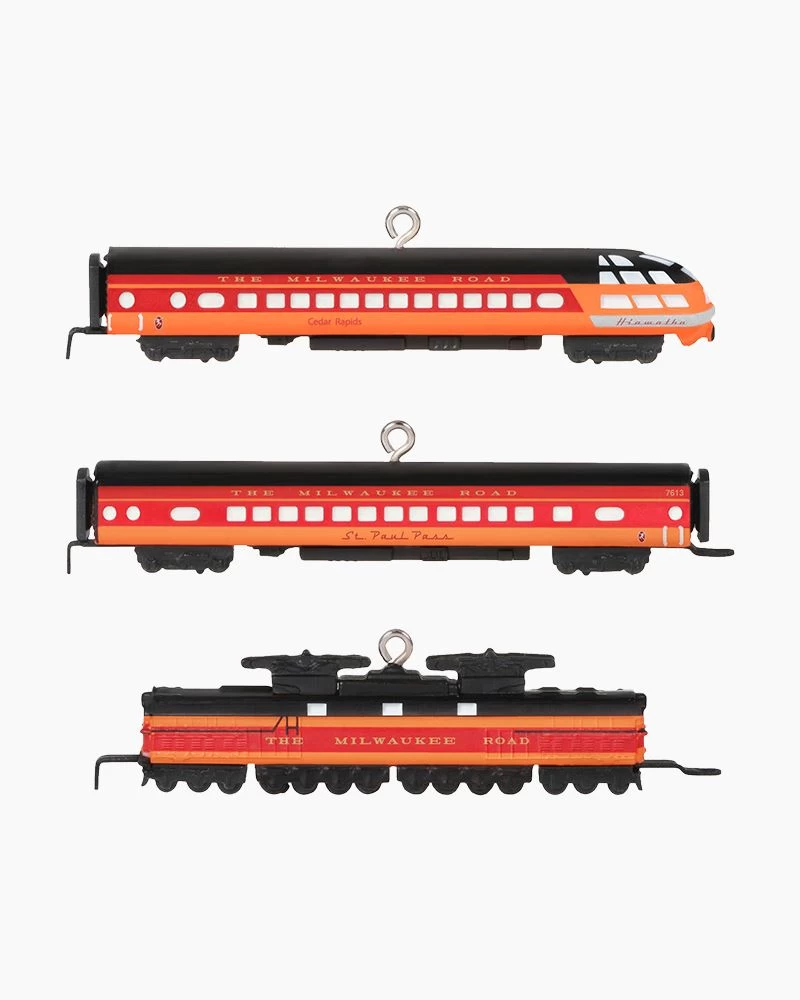 Bask in the legacy of railway travel with this set of 3 Lionel Milwaukee Road EP-2 Passenger miniature Christmas tree ornaments. Perfect for the train collector on your list, this set representing “the mightiest electric locomotive in the world” includes the red and orange engine and passenger cars with signature The Milwaukee Road markings.