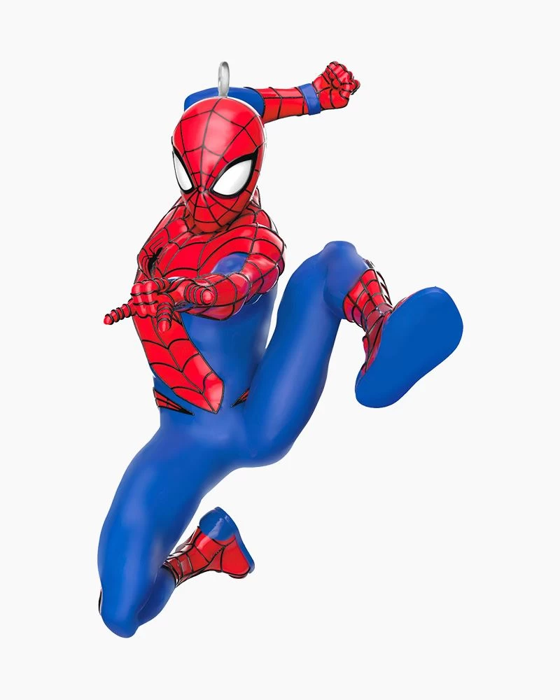Swing into the holiday spirit with double the Super-Hero power. This set of two miniature Christmas tree ornaments features the Marvel Comics web-slinger Spider-Man in red and blue, along with Miles Morales, the Brooklyn teen who took on the mantle in an alternative reality, in black and red, both in action poses.