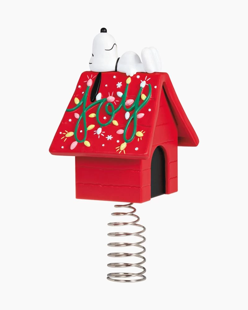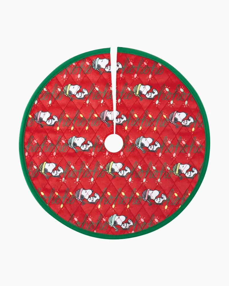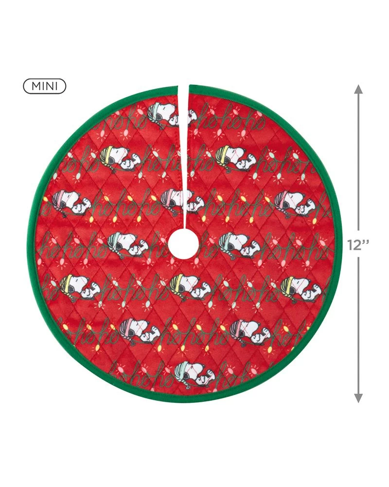 Join Peanuts pal Snoopy and get your tabletop tree ready for Santa’s arrival with this miniature Christmas tree skirt and tree topper set. Charlie Brown’s beloved beagle takes a rest after decorating his iconic red doghouse with a message of “Joy” in Christmas lights on the mini tree topper featuring a metal spring coil base. The coordinating red and green fabric mini tree skirt features a printed design of Snoopy in colorful stocking hats snoozing on light strings that spell “ho ho ho.”