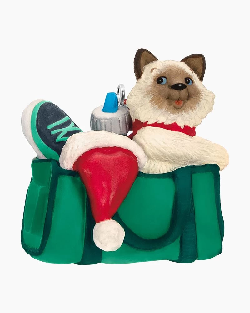 Delight cat lovers and gym-goers alike with this Mischievous Kittens Christmas tree ornament. With a big red bow around its neck, the adorably expressive kitty has made itself at home in a green gym bag, nestled beside a water bottle, tennis shoes and a Santa hat.