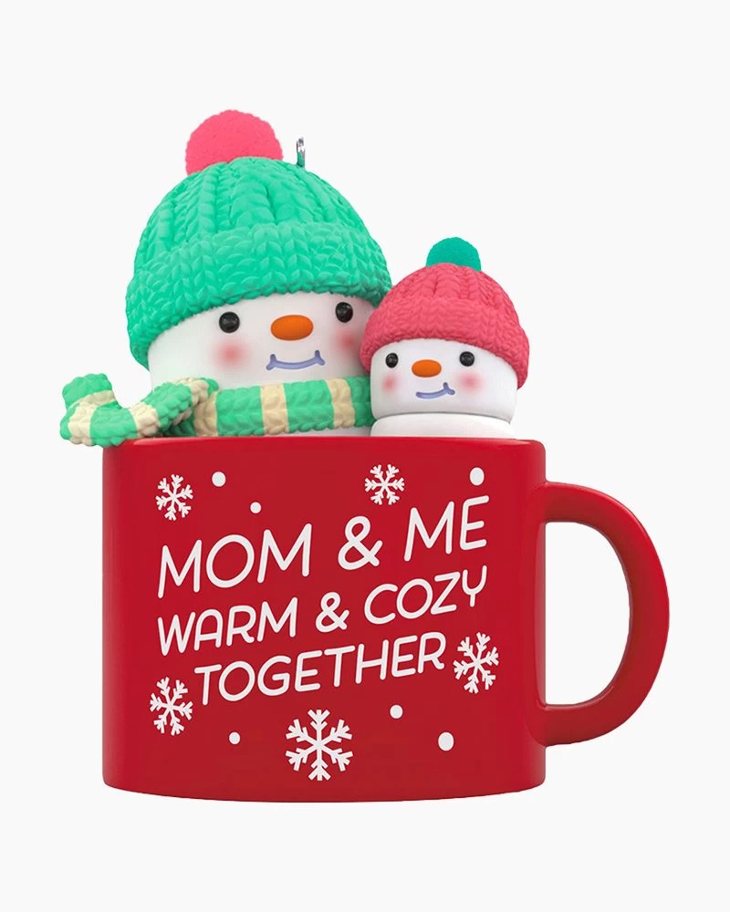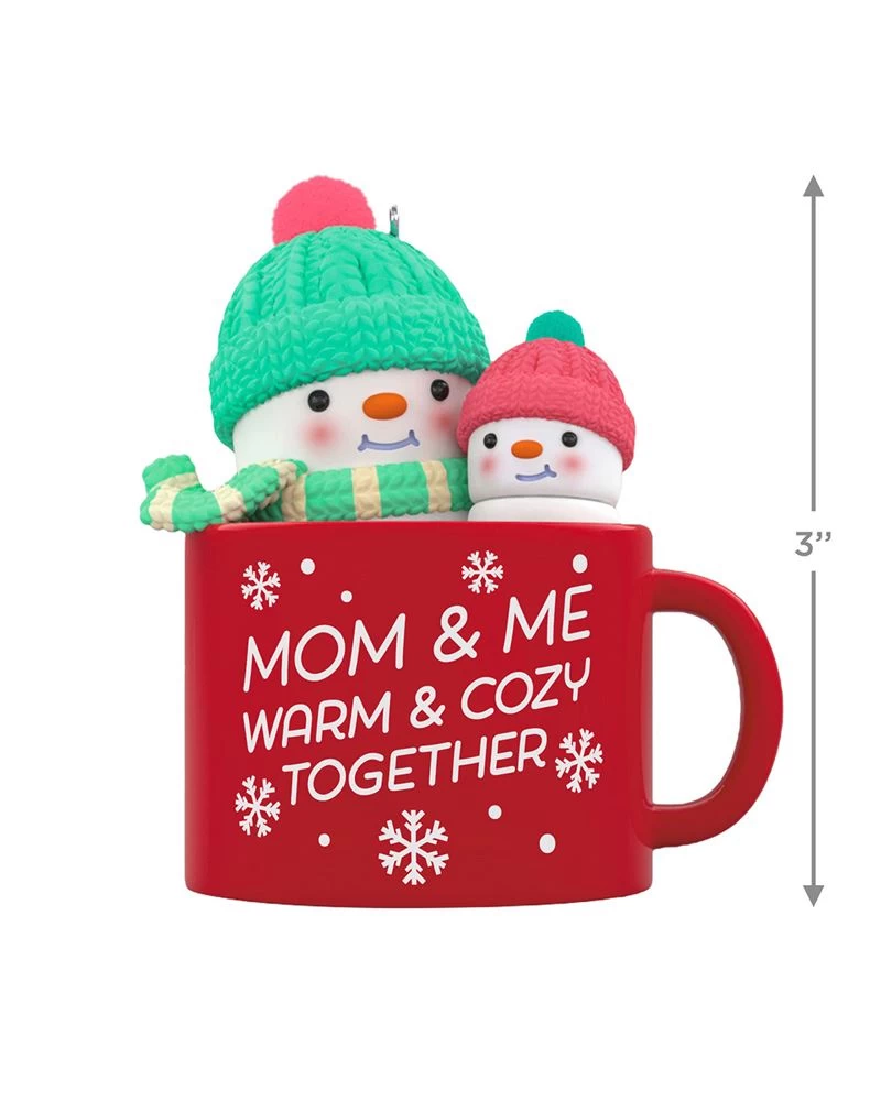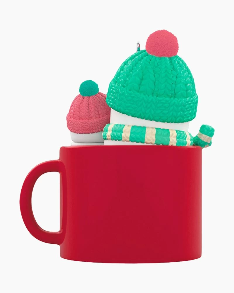 Cozy up for a sweet holiday season together! This cute Christmas tree ornament features a glittery, marshmallow snow-mom and her snow-kid taking a dip in a cocoa mug. Both mother and child are bundled up in coordinating winter hats, and the mug features a snowflake design with charming message.