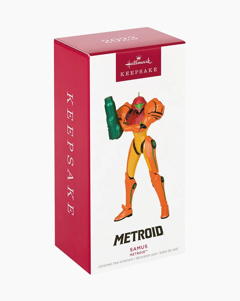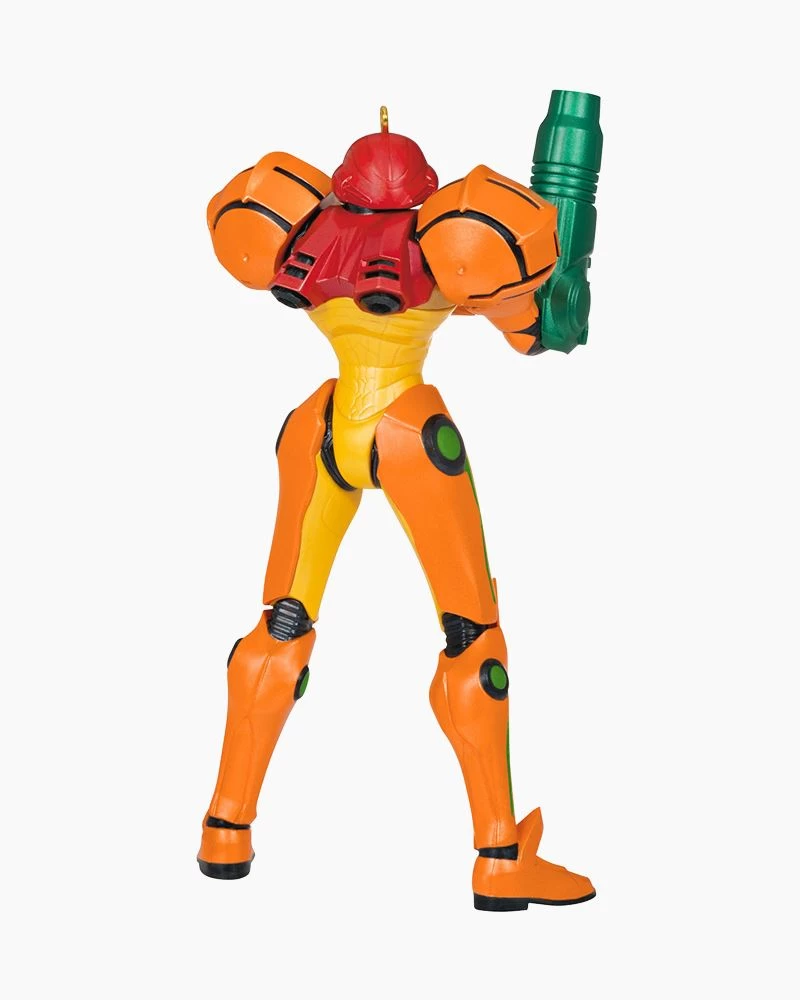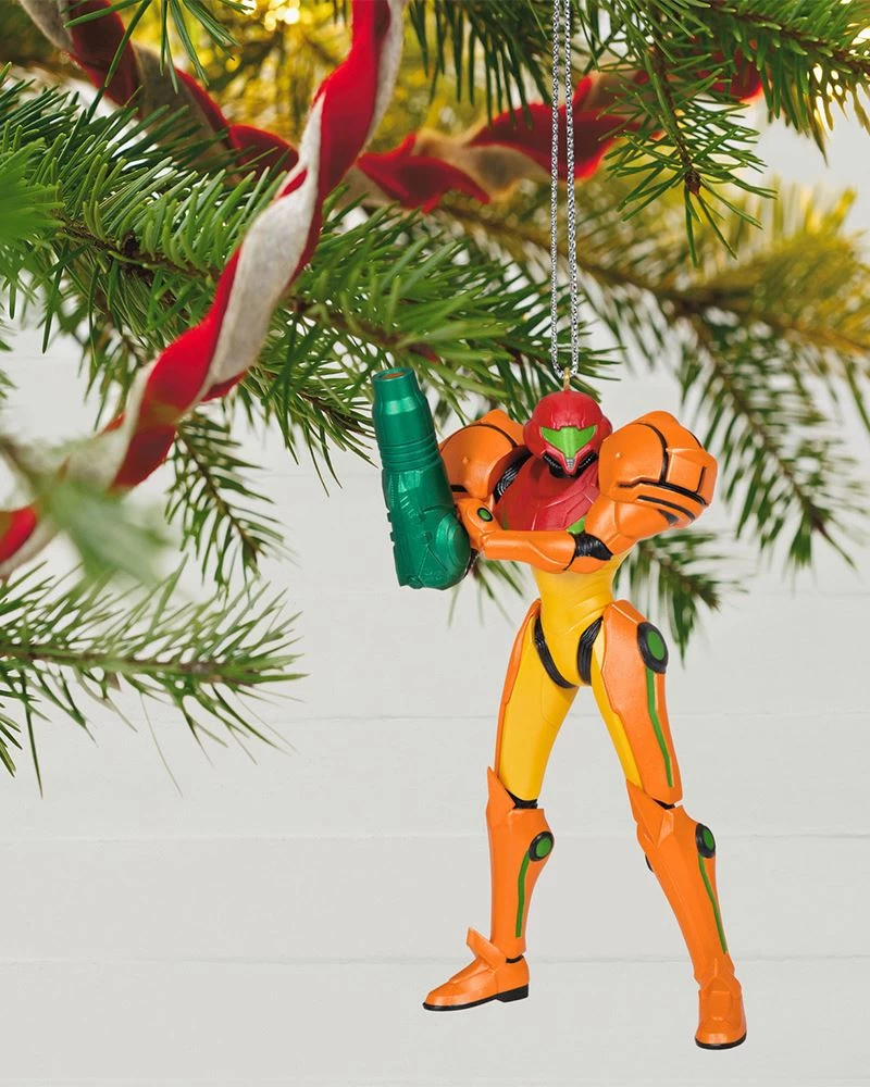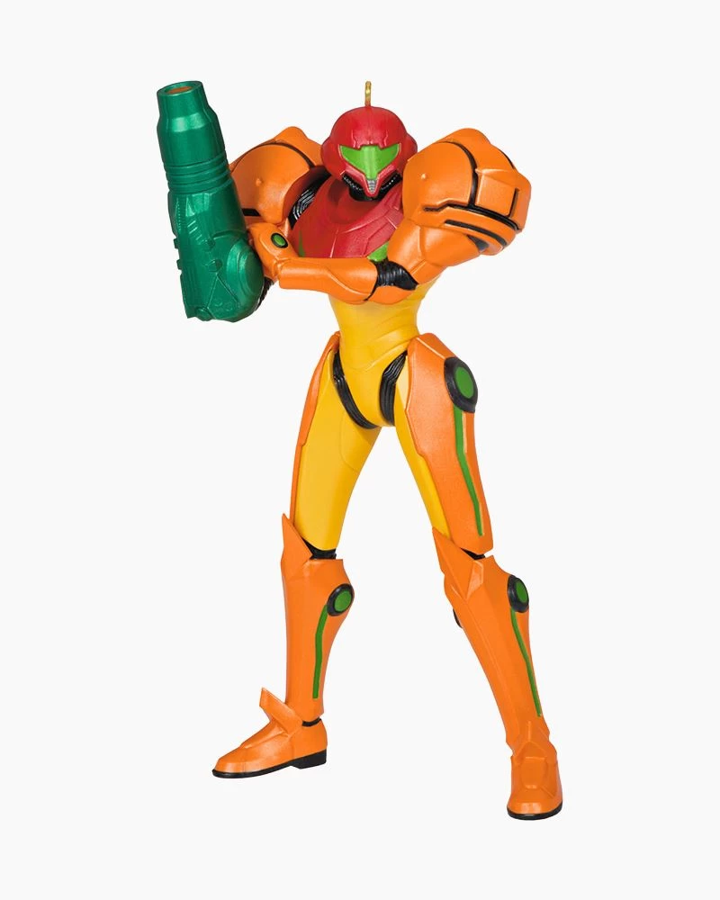 Bounty hunter Samus Aran works on behalf of the Galactic Federation to undertake the most dangerous of tasks, including missions that pit her against deadly Space Pirates. This Christmas tree ornament depicts the hero of “Metroid,” Nintendo’s popular action-adventure game series, equipped with her powered armorsuit and ready to take on hostile enemies from alien worlds.