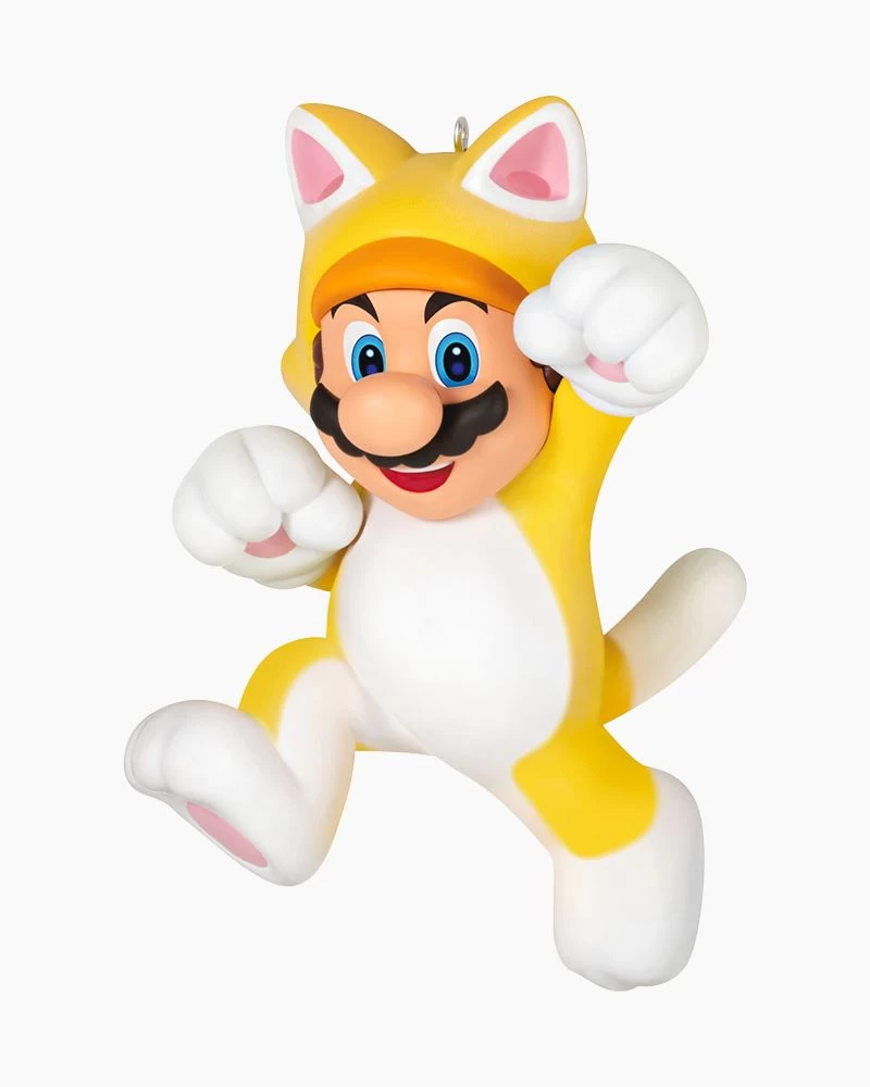 Transform your holiday decor with this Cat Mario Christmas tree ornament, the latest in the Powered Up With Mario series. With brilliant color and detail, Mario takes on his cat form after obtaining the Super Bell in the popular “Super Mario 3D World” video game. Make it a super season with this fun decoration hanging on your tree, or give it to a gamer to power up their holidays.