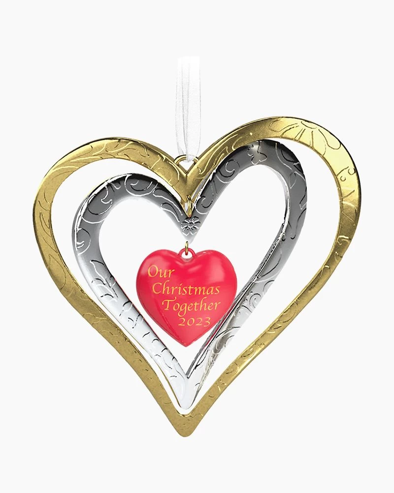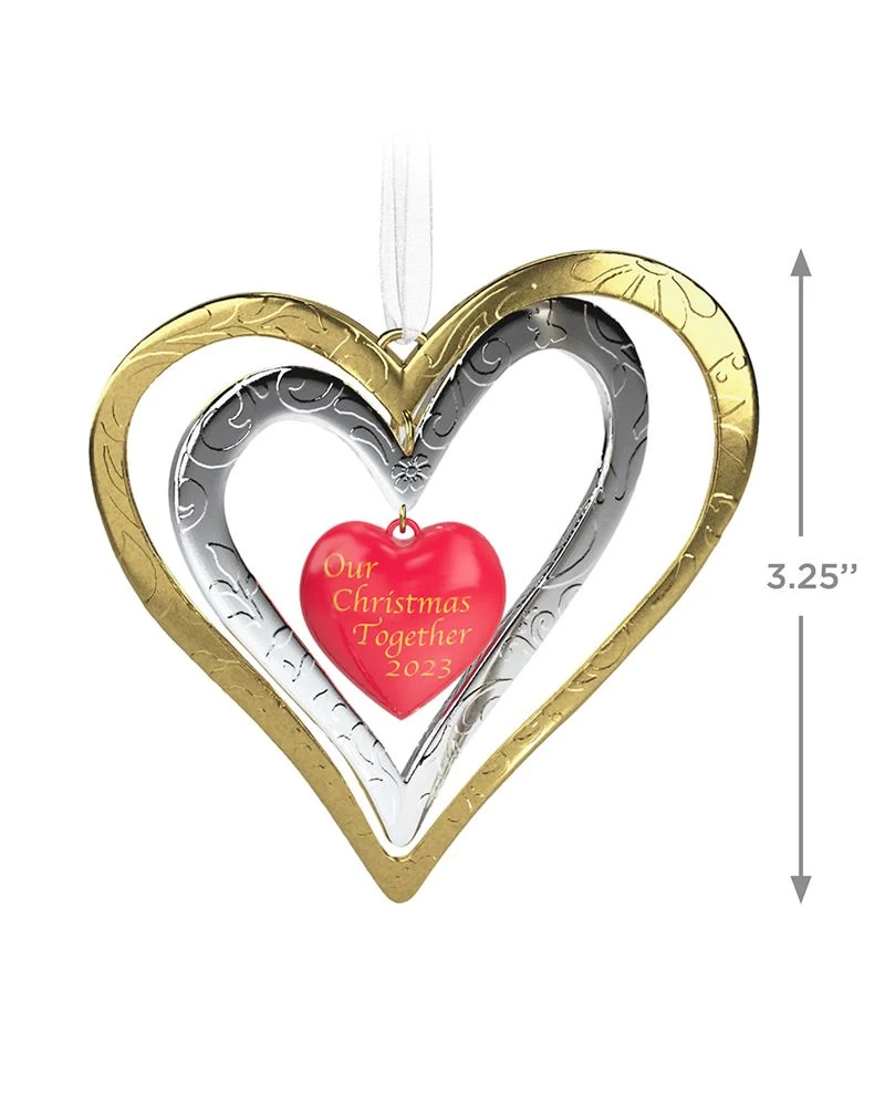 Give them a gift they’ll cherish for years to come. This beautiful double-heart Christmas tree ornament features embossed details on metal gold- and silver-toned heart outlines, finished with a red heart charm dangling in the center. Year-dated 2023, it’s an especially lovely keepsake for newlyweds or any new couple.