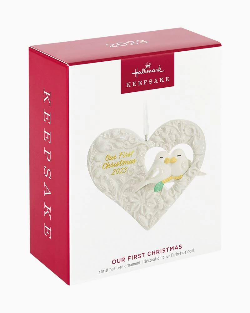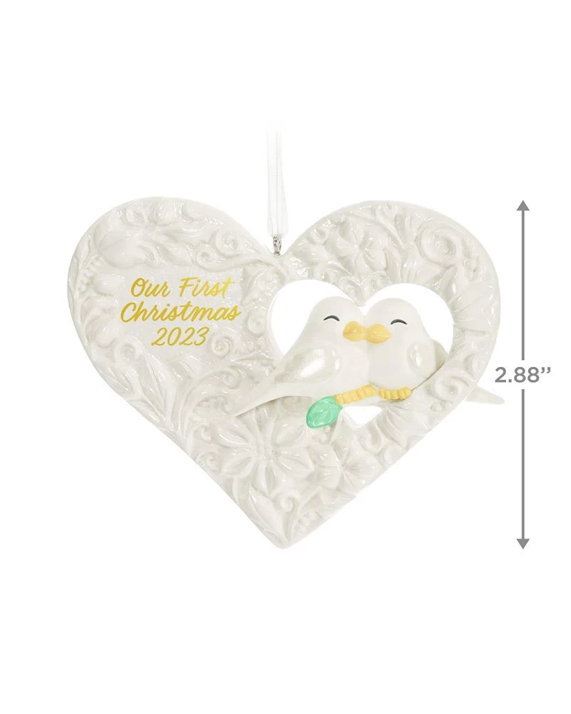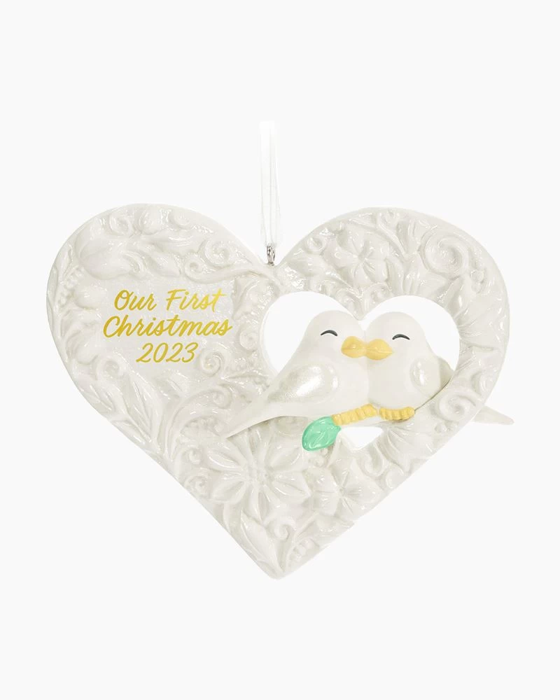Give them a gift to have and to hold for years to come. This beautiful porcelain heart Christmas tree ornament features ornate embossed detailing with a pair of white doves perched in a heart-shaped opening. Year-dated 2023, it’s an especially lovely keepsake for newlyweds or any new couple.