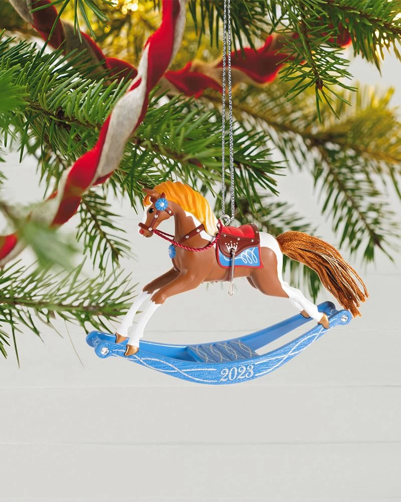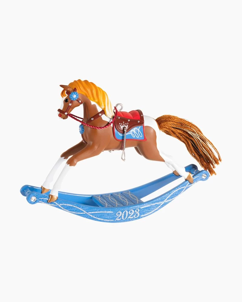 Inspire the joy of the holiday season, along with memories of beloved decorations from days past, with this addition to the Rocking Horse Memories series. This beautiful Christmas tree ornament features a chestnut brown-and-white Spotted Saddle Horse with a yarn tail and gem accents on the rocker.