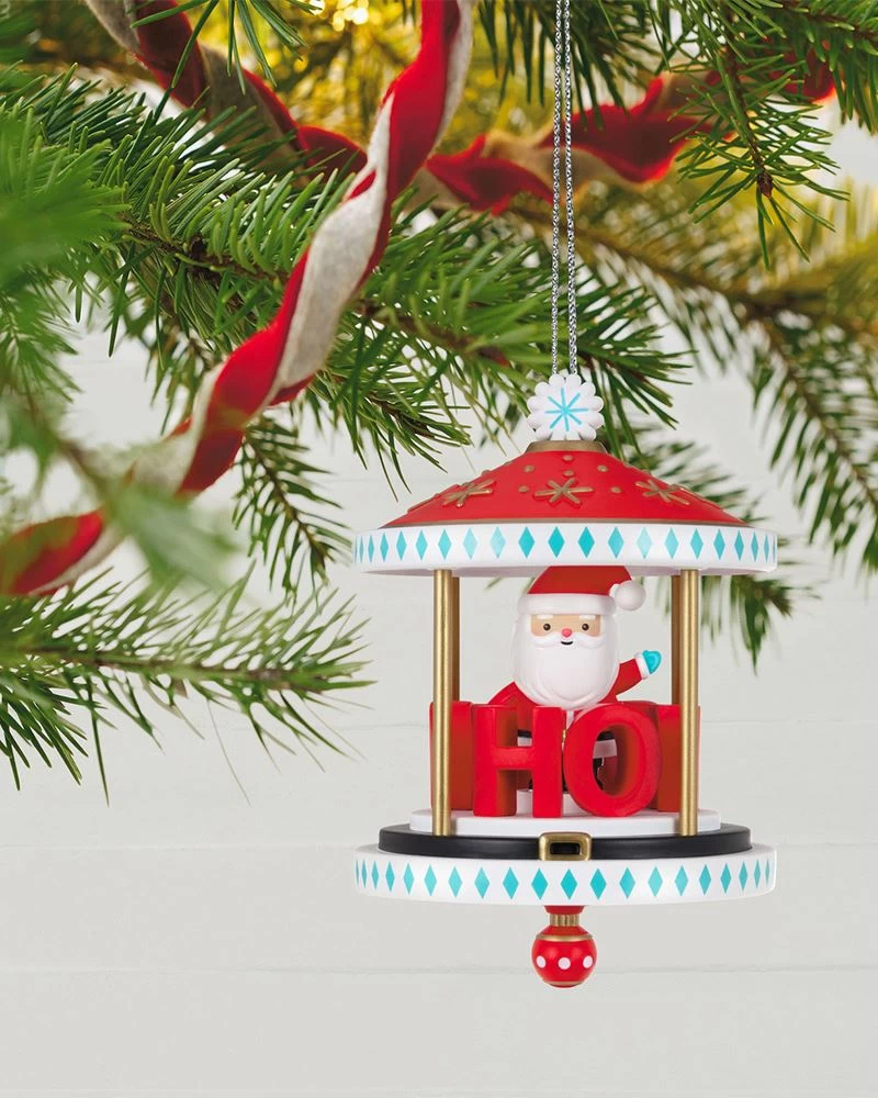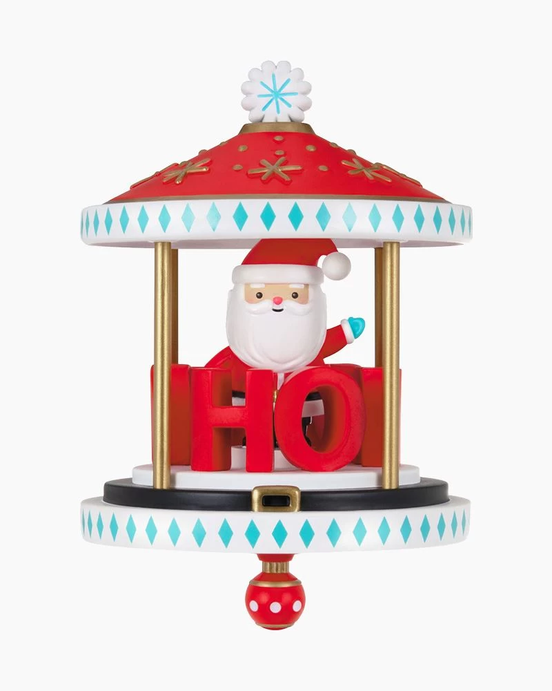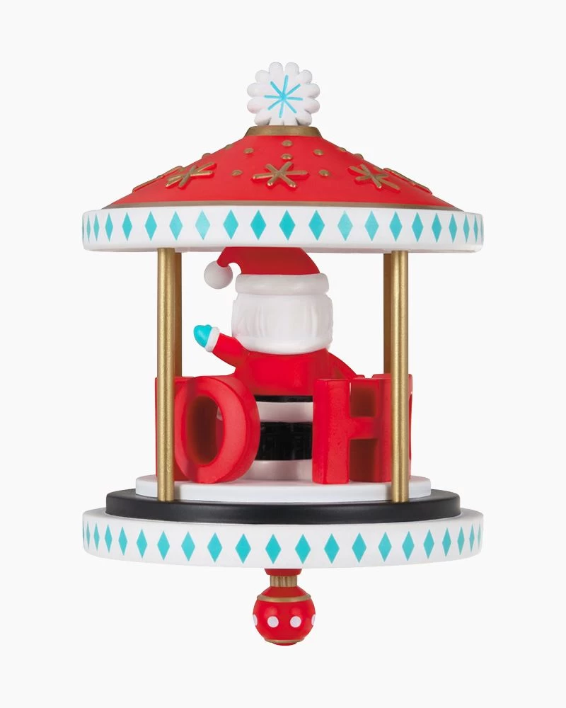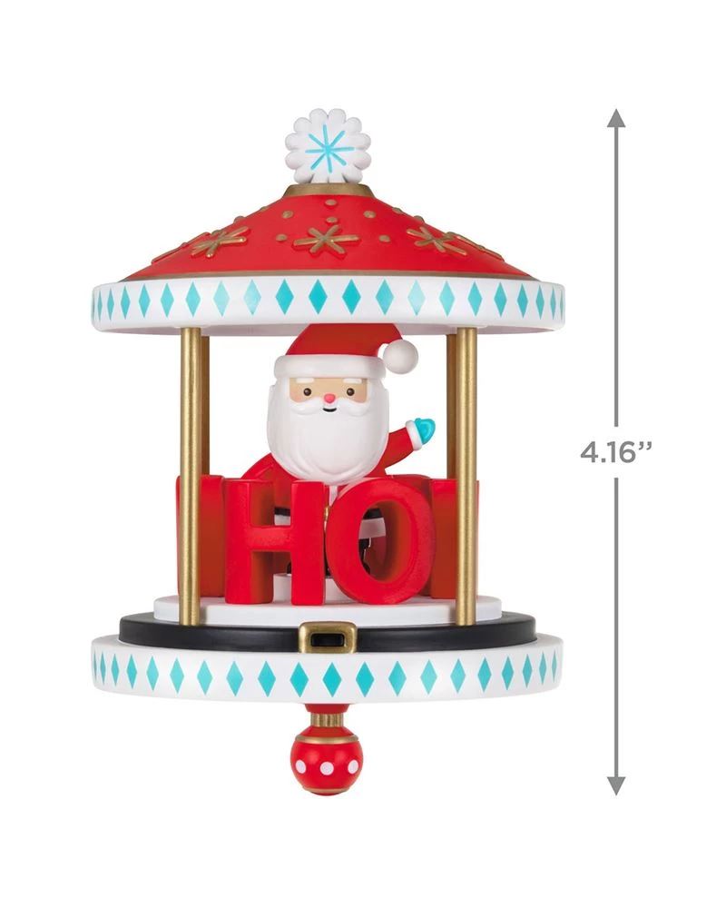 Ho! Ho! Ho! Santa is here to wish you a fun and festive merry Christmas! Santa stands with a waving pose in the middle of a holiday carousel design in this charming Christmas tree ornament. Turn the knob on the bottom to see block letters spin his cheerful greeting.