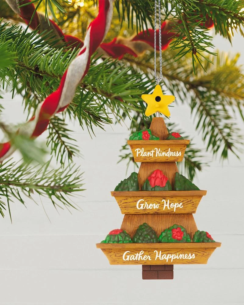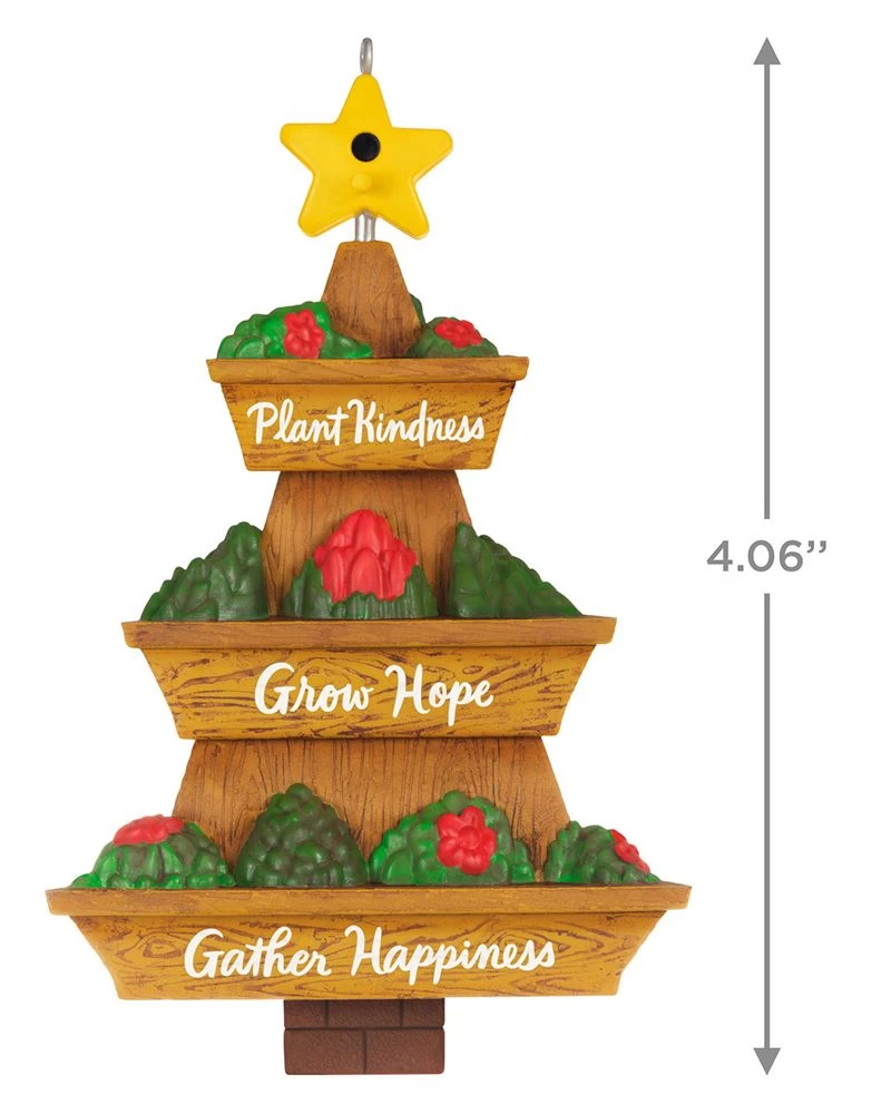 Give an avid gardener this Christmas tree ornament and plant kindness in their holiday season. A thoughtful message decorates the tiered garden planter that resembles a wooden Christmas tree and is topped with a yellow star-shaped birdhouse.