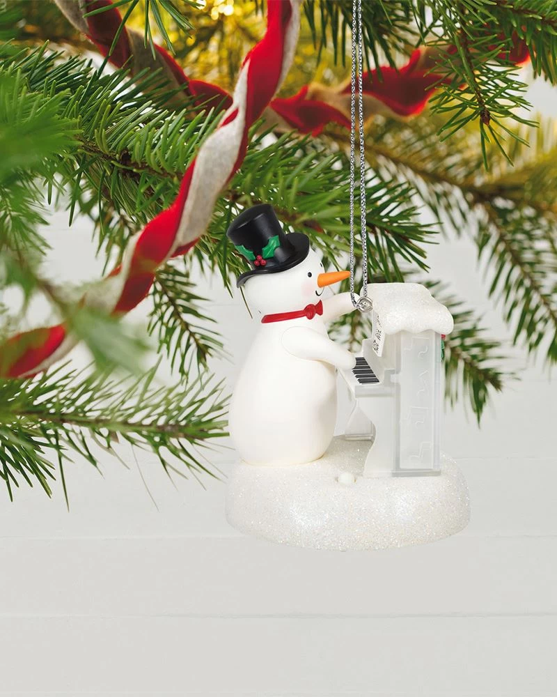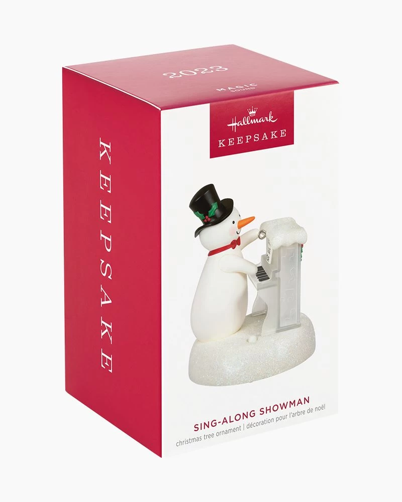 ‘Tis the season for gathering with friends and family to sing Christmas carols! Capture special holiday moments with this Christmas tree ornament featuring a snowman, dressed in a festive top hat and bow tie, playing a piano and singing a lighthearted version of “We Wish You a Merry Christmas” when you press the button (battery-operated). Coordinating Sing-Along Showman snowman stuffed animal sold separately.