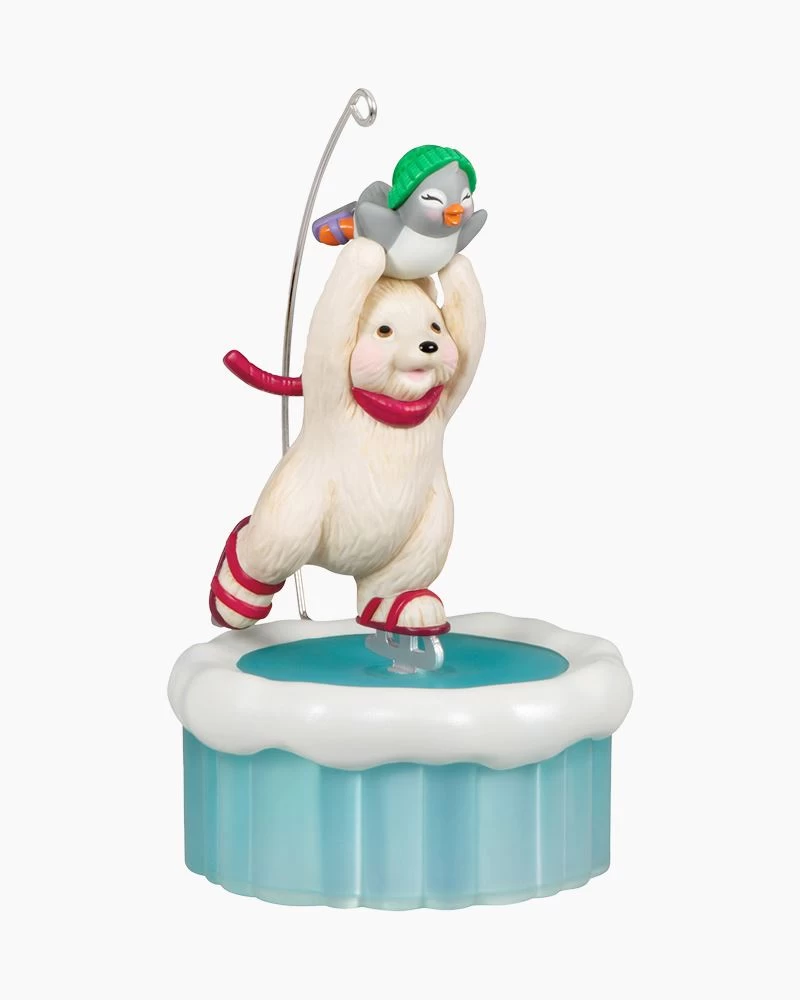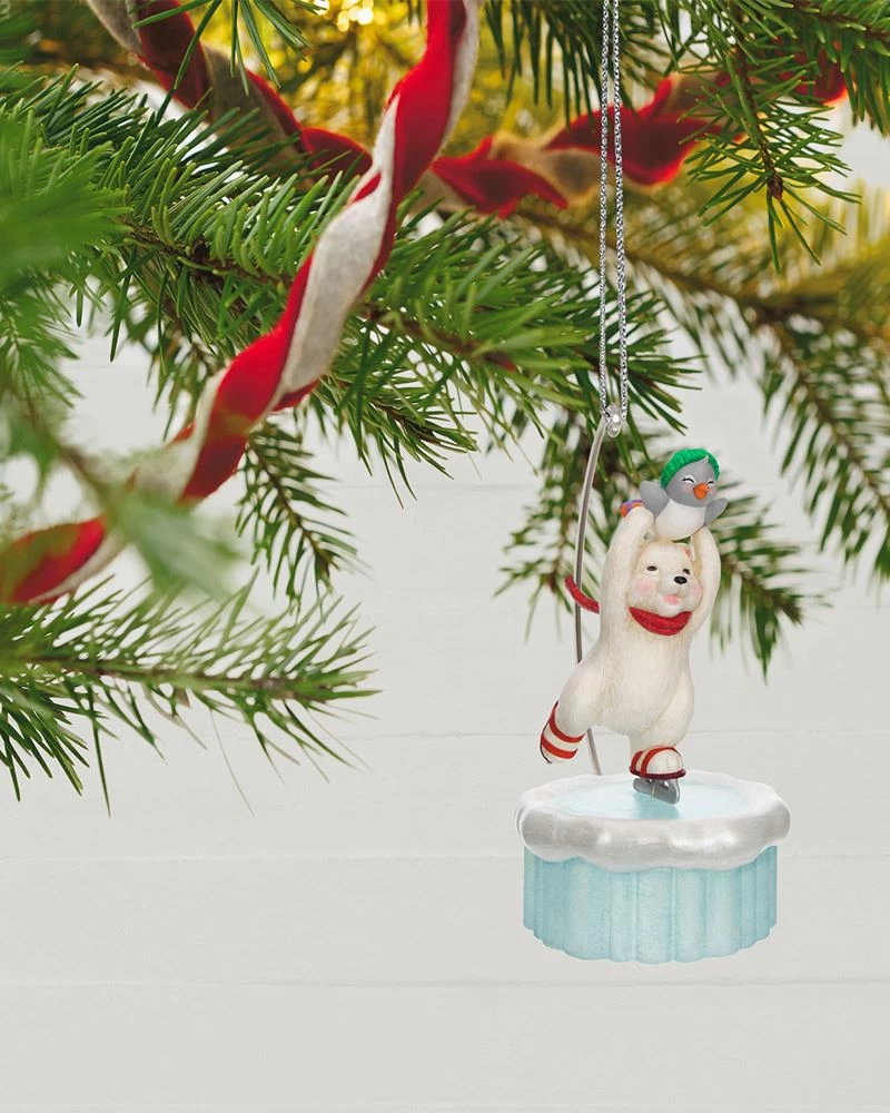 Add some wintertime fun to the holidays with this sweet Christmas tree ornament. Connect the charming decoration to Hallmark’s Keepsake Power Cord (sold separately) to watch Snowball the polar bear skate across a shimmery piece of ice with his polar pal Tuxedo the penguin hoisted overhead.