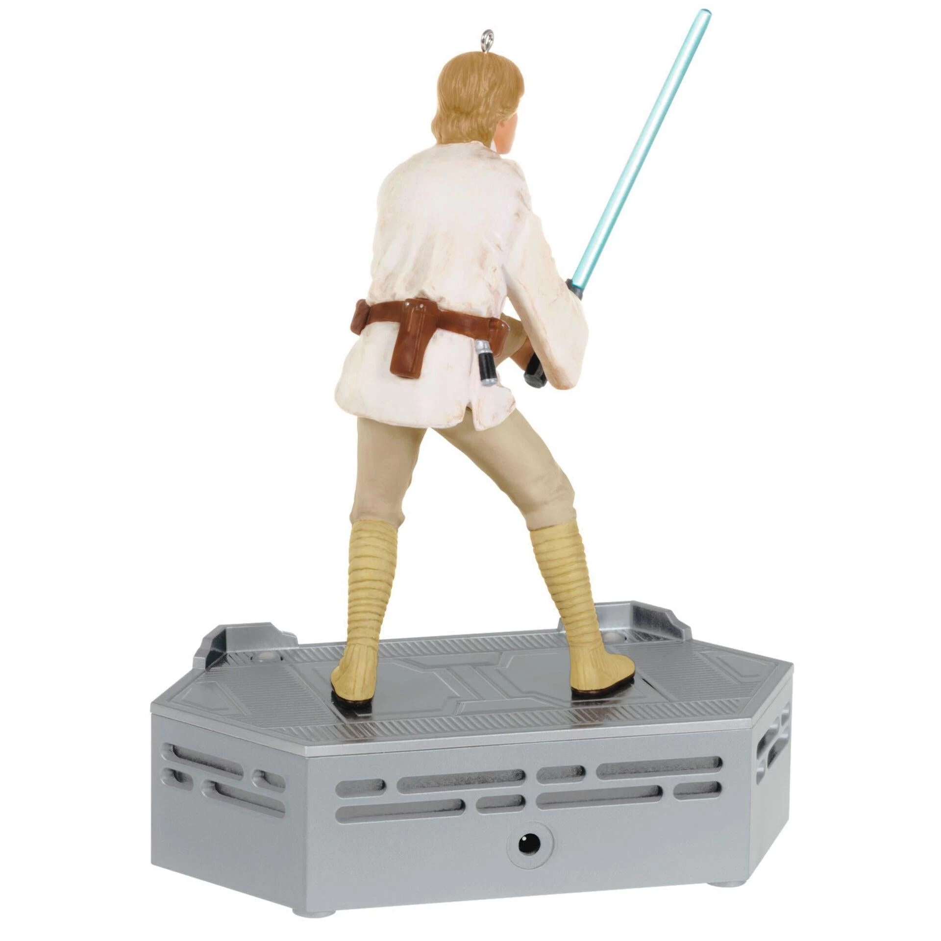 Before he crossed paths with droids R2-D2 and C-3PO and followed Obi-Wan Kenobi to learn the ways of the Force, Luke Skywalker was a farmboy on Tatooine biding his time for the next harvest season. This Christmas tree ornament features the legendary hero wielding his lightsaber at the beginning of his journey to become a Jedi. Plug the ornament into Hallmark’s Keepsake Power Cord (sold separately) for constant illumination, then press the button to start an epic sound and light show scene. Connect all of the Star Wars: A New Hope Storytellers ornaments—Luke Skywalker, Obi-Wan Kenobi, C-3PO and R2-D2, Princess Leia Organa, Darth Vader, Han Solo and Chewbacca—and the Death Star Tree Topper (each sold separately) to unlock additional amazingly interactive performances.