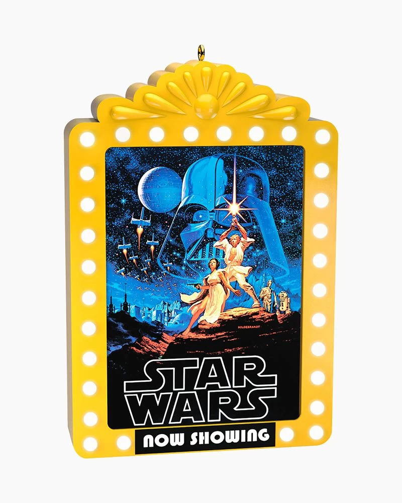 Show off one of your favorite films – Star Wars: A New Hope – with this lighted movie marquee Christmas tree ornament. The iconic Hildebrandt one-sheet poster art is the main attraction in this framed design that features art nouveau flair and a continuous light effect when connected to Hallmark’s Keepsake Power Cord (sold separately).