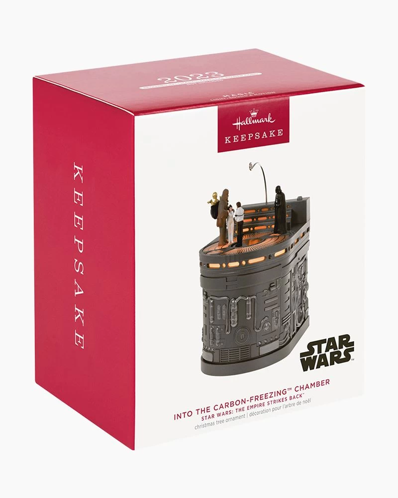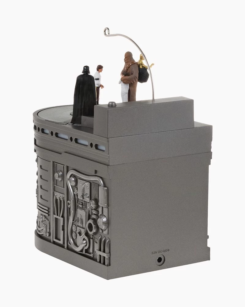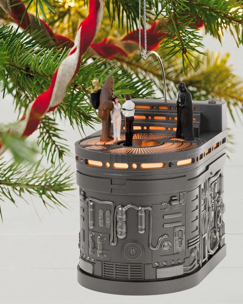 As part of Darth Vader’s attempt to capture Luke Skywalker in Star Wars: The Empire Strikes Back, Han Solo served as both bait and test subject for the carbon-freezing process. This Christmas tree ornament depicts the emotional scene on Cloud City, which culminates in Han and Leia’s iconic profession of love and Han’s encasement in carbonite. The dynamic decoration features LED lights for a constant glow. Push the button to see a synchronized sound and light performance, complete with motion, as the Rebel heroes face an uncertain fate. Requires Hallmark’s Keepsake Power Cord (sold separately).
