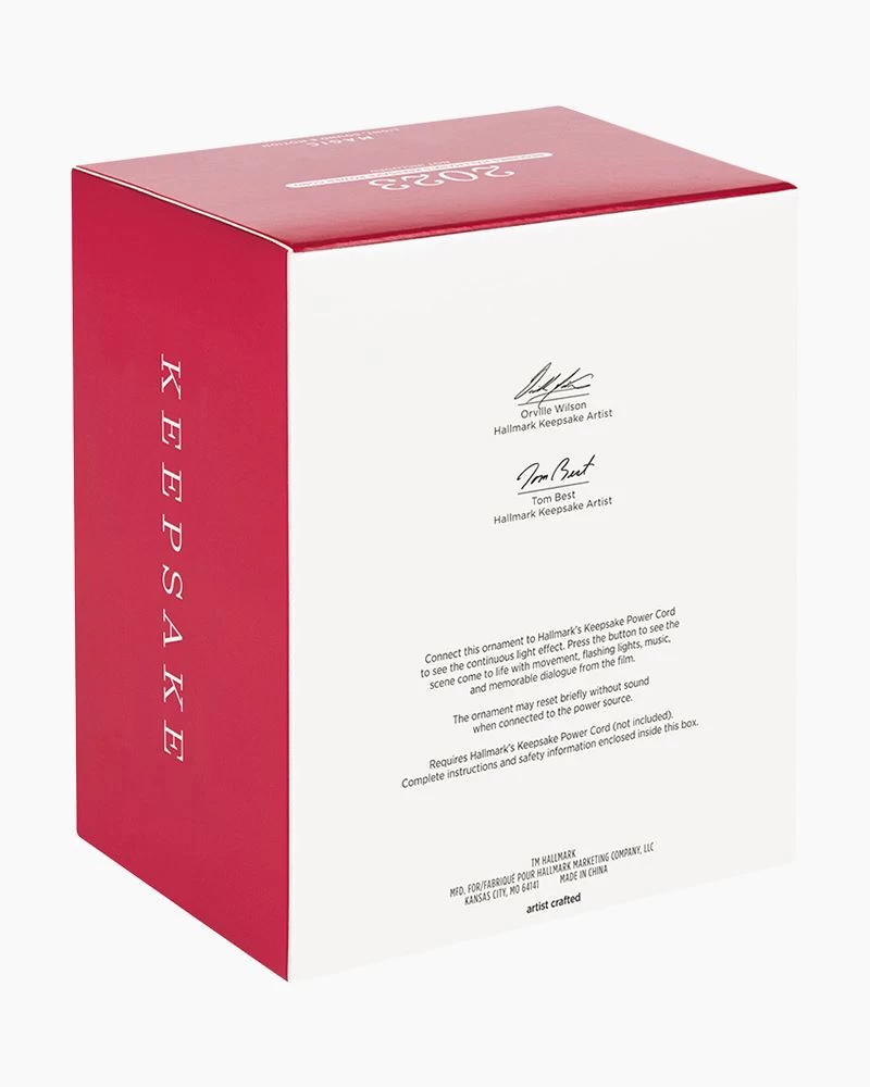 - Key Features: Connect this Magic Light, Sound and Motion ornament to Hallmark’s Keepsake Power Cord (sold separately) to see the continuous light effect. Press the button to see the scene come to life with movement, flashing lights, music and memorable dialogue from the film. The ornament may reset briefly without sound when connected to the power source