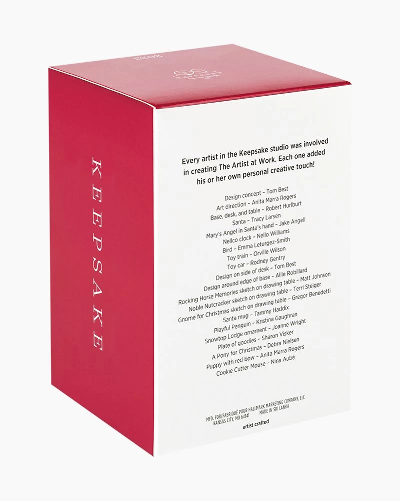 Santa Claus is a very busy man, designing special gifts for all the nice girls and boys on his list. Delight in his personal workspace with this incredible Christmas tree ornament. Every artist in the Keepsake Studio was involved in creating the handsome piece, crafting each element with his or her own personal creative touch. Intricate detailing in the desk, toys and pieces resembling beloved Keepsake Ornament designs makes this decoration perfect for celebrating 50 years of Hallmark Keepsake Ornaments.